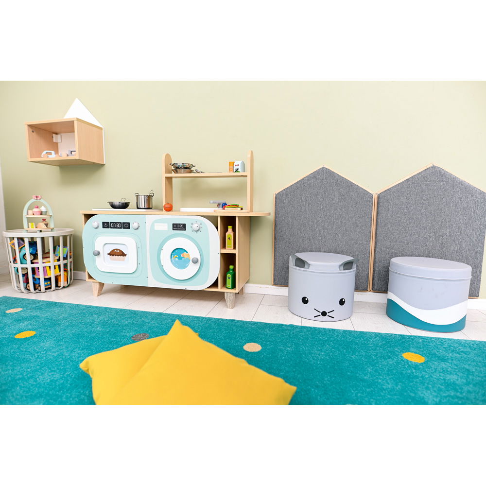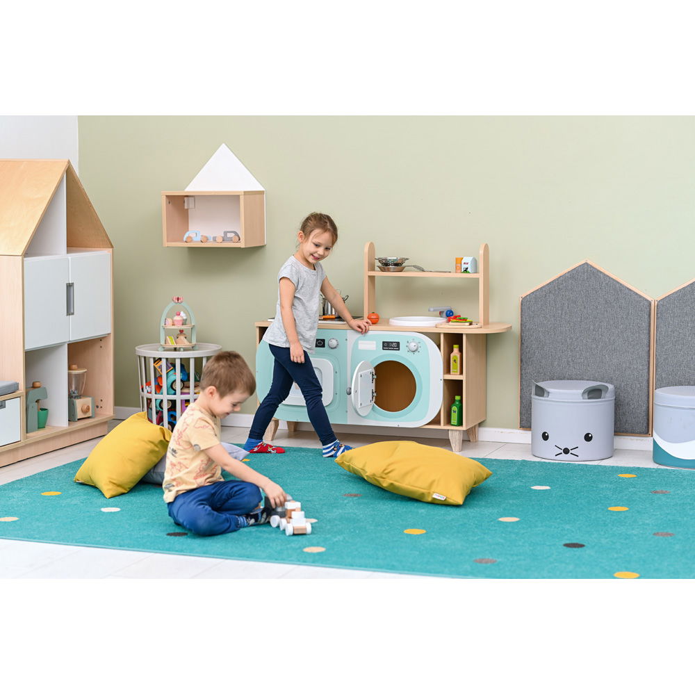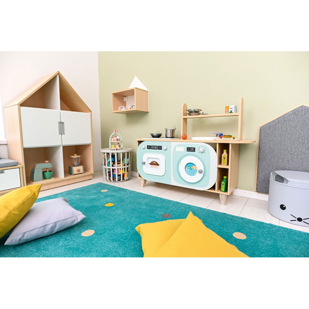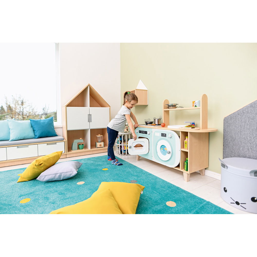 Die offenen Gestaltungselemente lassen Raum für Interpretation. Eine Waschmaschine wird zum Kühlschrank, der Herd zur Mikrowelle – das Spielzeug passt sich den Ideen der Kinder an.