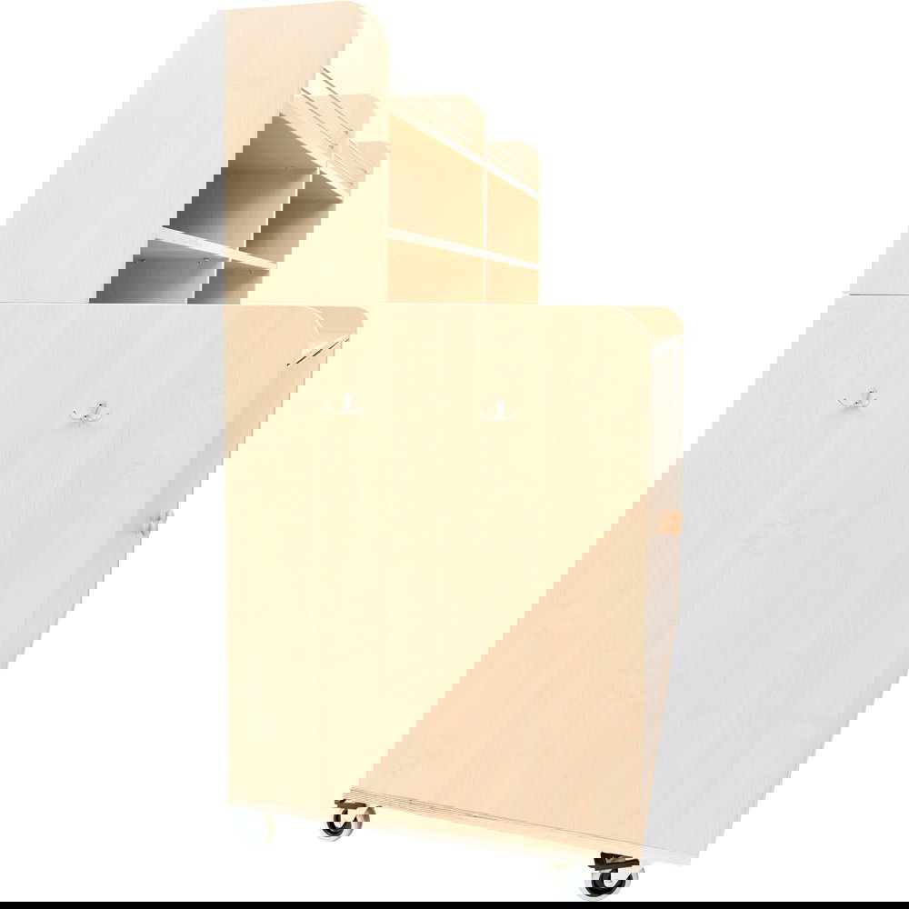 Die robuste Konstruktion aus pflegeleichter, laminierter Spanplatte hält den täglichen Anforderungen mühelos stand. Als Arbeitsfläche dient eine widerstandsfähige Platte aus Sperrholz, die Ihnen zusätzlichen Platz zum Vorbereiten oder Abstellen bietet. Das wahre Highlight dieses Büffets ist jedoch seine Mobilität: Ausgestattet mit vier leichtgängigen Rollen, von denen sich zwei sicher feststellen lassen, können Sie den Schrank jederzeit genau dorthin schieben, wo er gebraucht wird. Ein stabiler Griff an der Seite macht den Transport besonders einfach. Auf der gegenüberliegenden Seite befinden sich praktische Haken, an denen Sie Handtücher oder kleine Utensilien griffbereit aufhängen können.