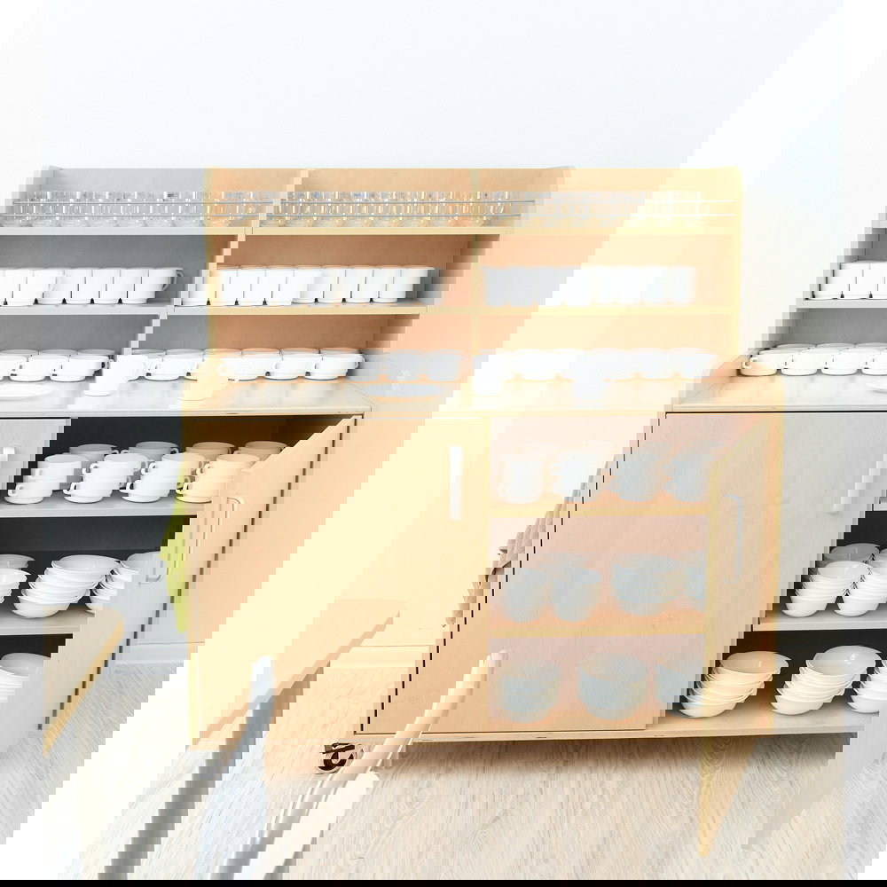 Im Inneren überzeugt das Küchenbüffet durch ein intelligentes Platzangebot. Hinter jeder Tür verbergen sich zwei Einlegeböden, die Sie in der Höhe flexibel anpassen können. So bringen Sie große Schüsseln ebenso mühelos unter wie kleine Teller oder Tassen. Zur Reinigung und Desinfektion der Möbeloberflächen verwenden Sie am besten milde Präparate mit geringer Alkoholkonzentration, um das Material langfristig zu schonen.