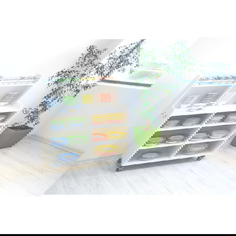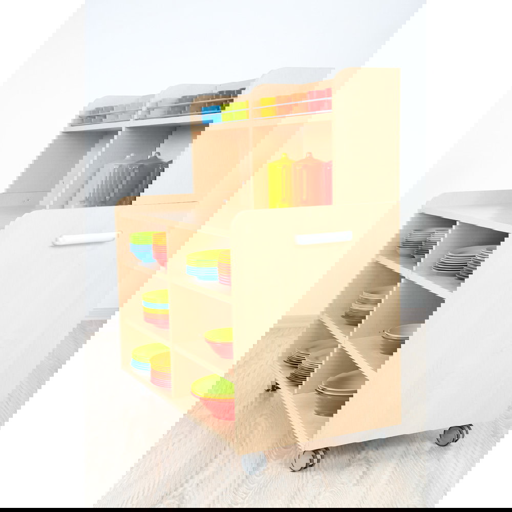 Ein reibungsloser Ablauf bei den Mahlzeiten oder beim gemeinsamen Basteln erfordert in Betreuungseinrichtungen eine kluge Raumgestaltung. Oft müssen Geschirr, Arbeitsmaterialien oder Spielsachen genau dort griffbereit sein, wo sie gerade gebraucht werden. Unser geräumiges Küchenbüffet auf Rollen ist die perfekte Antwort auf diese dynamischen Anforderungen. Es kombiniert viel Platz mit uneingeschränkter Mobilität und fügt sich nahtlos in jeden Raum ein. Ob im Gruppenraum, in der Mensa oder im Hort – dieses praktische Möbelstück passt sich Ihrem Alltag an und transportiert alles sicher an den gewünschten Ort.