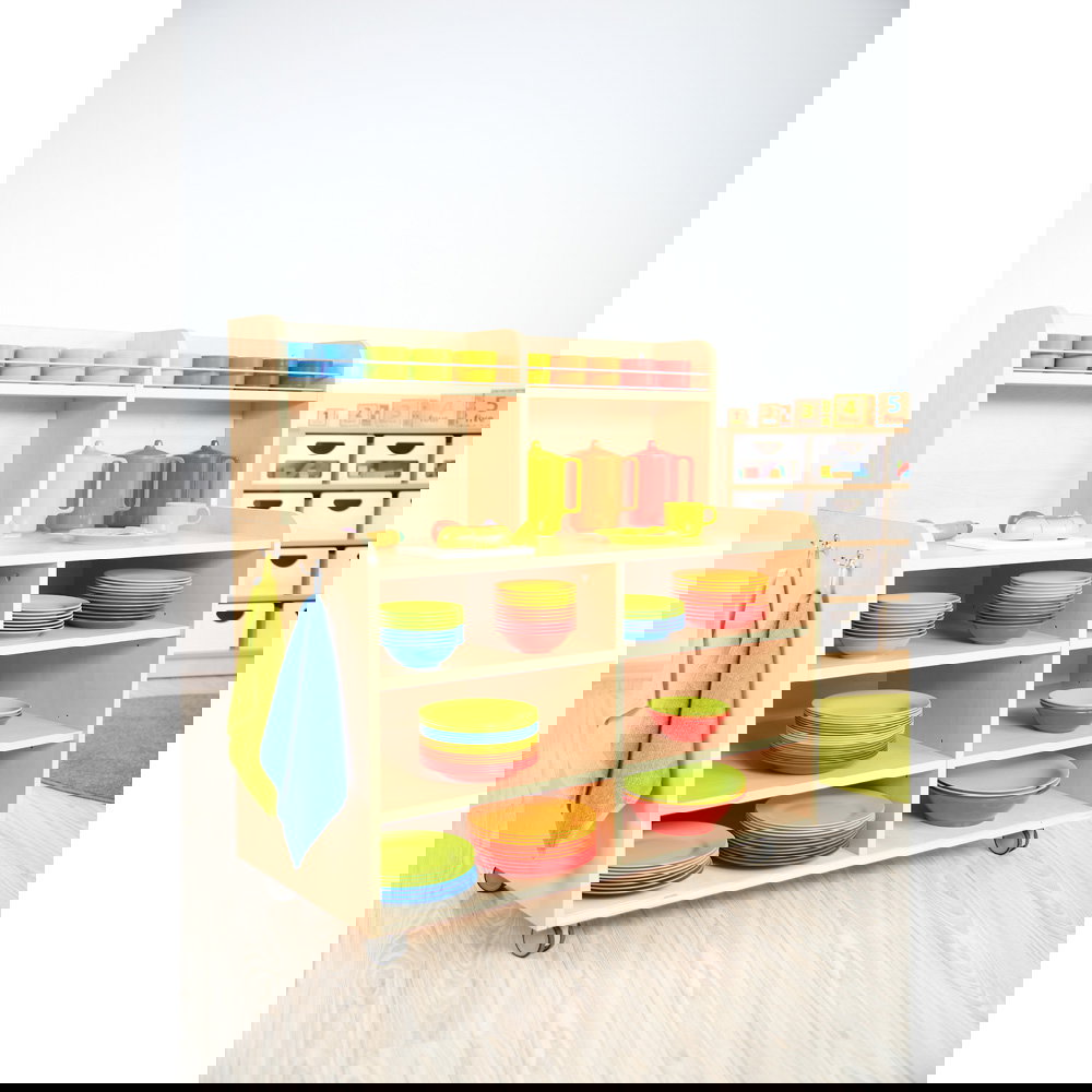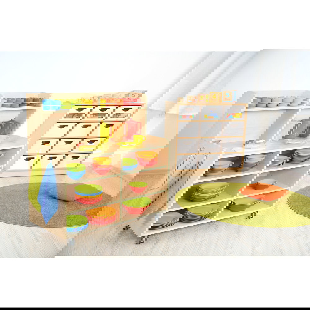 Die Arbeitshöhe von 65 Zentimetern erlaubt es Kindern, selbstständig Geschirr zu entnehmen oder abzustellen, was ihre Unabhängigkeit im Alltag fördert. - Strukturierte und sichere Aufbewahrung