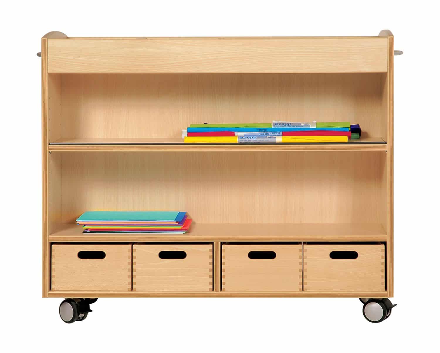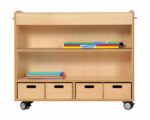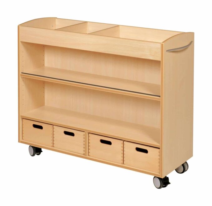 Die Künstler Lotte bietet oben ein großes Fach (49,5 x 36 cm) und zwei kleine Fächer (24 x 36 cm). Auf der Vorderseite befindet sich ein höhenverstellbarer Fachboden (101 x 25 cm). Die Rückseite verfügt über Platz für Farbflaschen (101 cm breit, 10 cm tief) sowie einen verstellbaren Fachboden für Becher (101 cm breit, 11 cm tief). Unten gibt es Platz für vier Materialkästen (bitte separat bestellen) oder alternativ für zwei Materialkästen und Papier im Format A3. Dank der vier Lenkrollen, von denen zwei feststellbar sind, ist die Künstler Lotte flexibel und mobil einsetzbar.