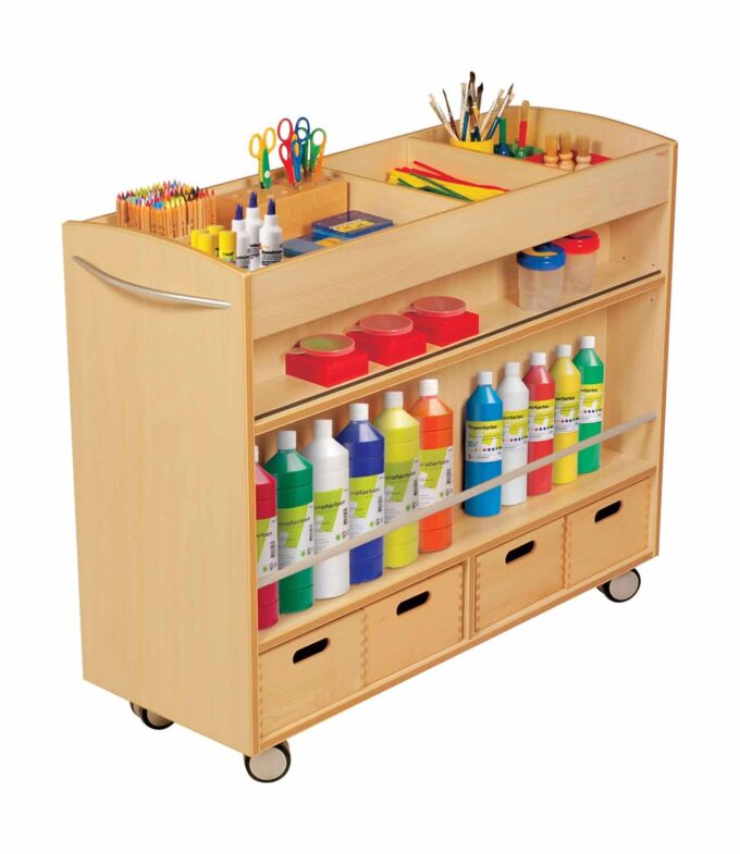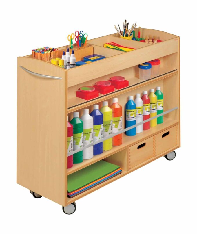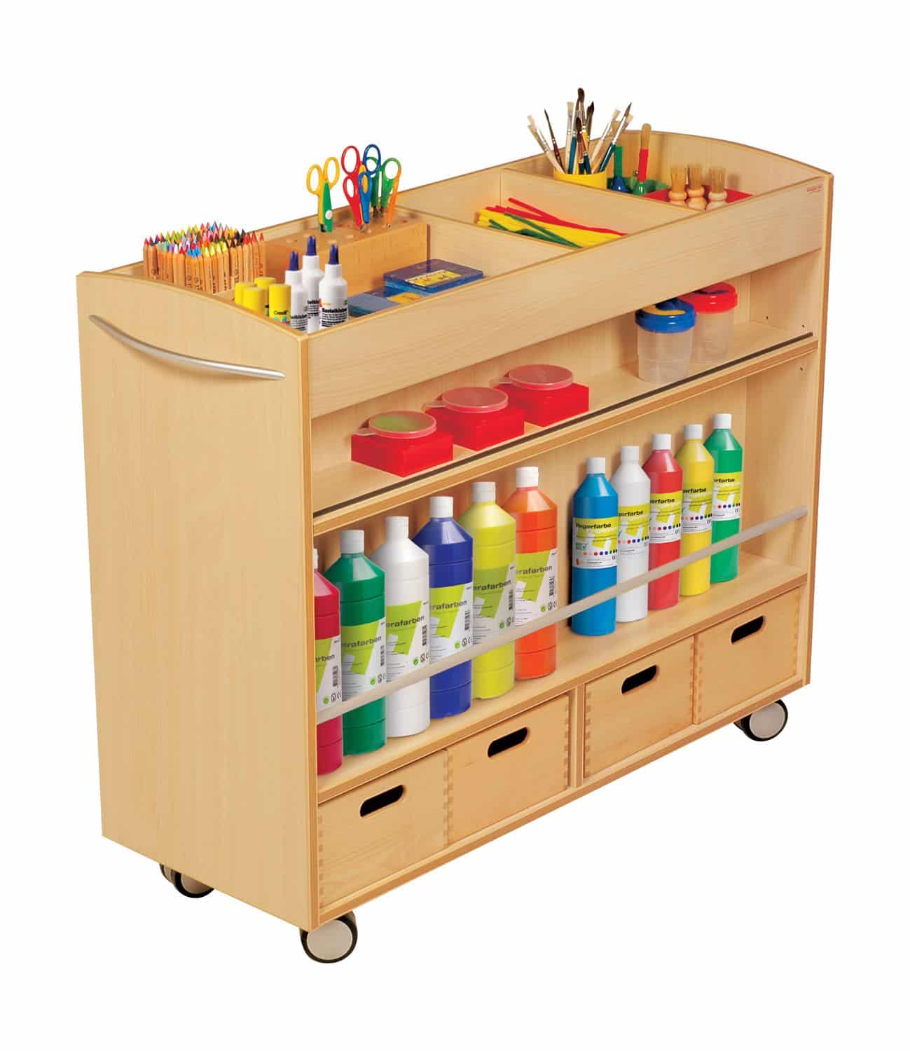 Die Künstler Lotte, Breite 105 cm von Dusyma ist der perfekte Mittelpunkt jedes Kinderateliers. Dieser vielseitige und gut durchdachte Aufbewahrungswagen ermöglicht es Kindern, von allen Seiten auf Pinsel, Stifte, Scheren, Klebstoff und Papier zuzugreifen, und sorgt dafür, dass alles übersichtlich geordnet ist.