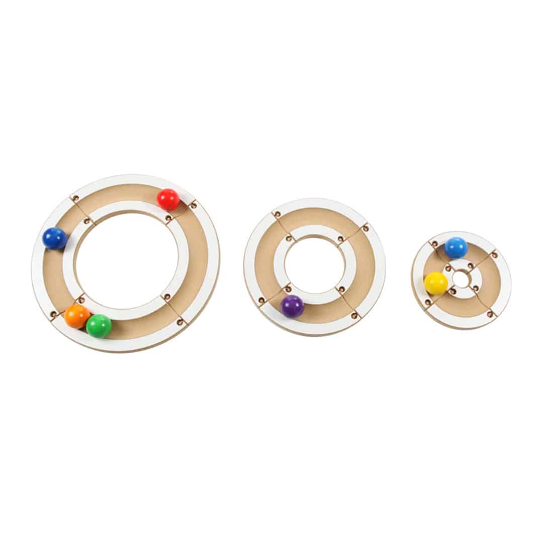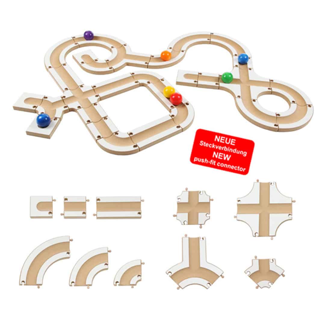 Bewegung – Motorik – Reaktion – Genaues beobachten. Für das Spiel allein oder in der Gruppe. „Bau uns eine Bahn und schieb uns an, damit wir rollen können ….“ sagen die bunten Kugeln. Das Kind gestaltet den Weg der Kugeln SELBST. Die Bauteile werden beim Zusammenfügen erkundet und zu kleinen oder großen Kreisen, zu langen Geraden, Kurven oder anderen Formen aneinander gereiht. Da es unzählige Variationen gibt, kann das Spiel immer wieder ganz neu entdeckt werden und wird nie langweilig. Das Besondere am Spiel ist, dass die Kugeln BEWUSST mit der Hand entlang der Bahn geführt werden. Sie müssen dabei immer wieder angeschoben, weiter gerollt oder auch gebremst werden. Das Kind beeinflusst selbst, ob sich die Kugeln langsam bewegen sollen oder schnell. Dabei ist es unwichtig, ob die Bahn geschlossen wird oder nicht. Wenn mehrere Kinder gemeinsam spielen, können sich die Kugeln treffen. Rollen sie gemeinsam weiter, sucht sich jede Kugel ihren eigenen Weg oder wollen sie sich wieder treffen?