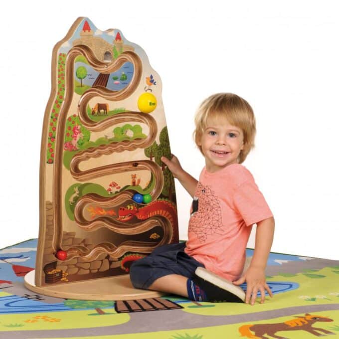 Verwandeln Sie jede Wand in ein Portal zu einer zauberhaften Welt! Ob im Gruppenraum der Kita, im Foyer oder im Wartezimmer – die Kugelbahn Märchenwelt von Erzi ist ein unwiderstehlicher Blickfang, der Kinder sofort in seinen Bann zieht. In diesem liebevoll gestalteten Wandspiel warten drei farbenfrohe Holzkugeln darauf, von kleinen Händen auf eine abenteuerliche Reise geschickt zu werden. Ihr Weg führt sie durch einen verwunschenen Märchenwald, vorbei an stolzen Schlössern und geheimnisvollen Drachen. Jeder Druck, jede Bewegung der Kugel wird zu einem kleinen Abenteuer.