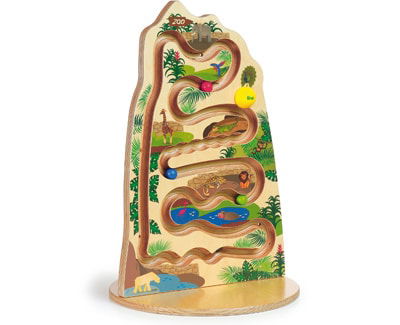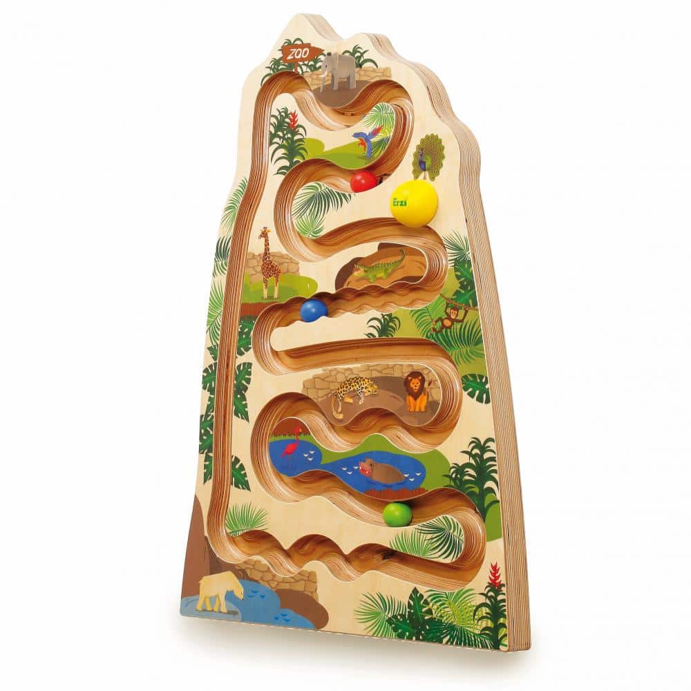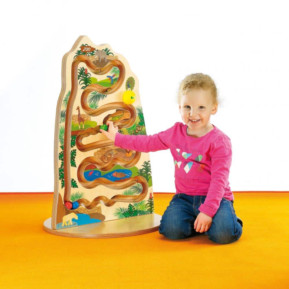 Ob Gruppenraum, Wartezimmer oder Foyer – die Kugelbahnen von Erzi sind ein echter Blickfang an jeder Wand. Drei farbige Kugeln aus Holz warten darauf, eine Tour durch den Zoo zu machen. Entlang an wilden Tieren und dichten Büschen erleben die Kugeln so manches Abenteuer. Die Kugeln verbleiben immer in ihrer Spur. Mit der Erzi – Bodenplatte (Art.-Nr. 51004) kann die Kugelbahn frei im Raum aufgestellt werden.
