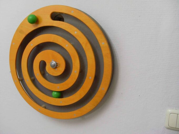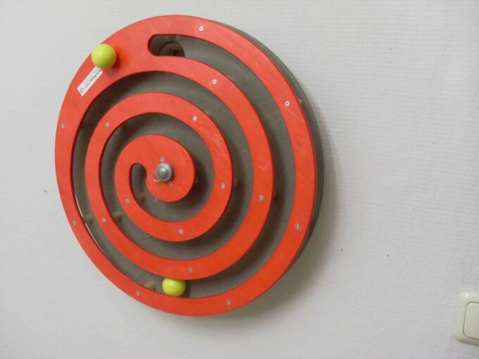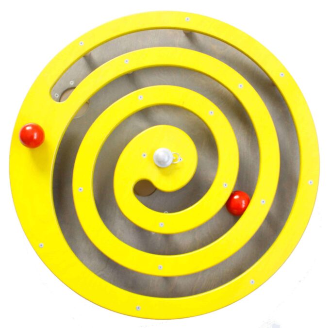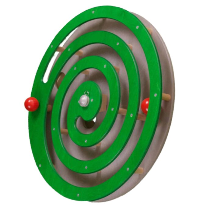 Dieses Wandspiel wird auf der mitgelieferten Holzplatte an der Wand befestigt und um den Mittelpunkt (Metallachse) gedreht. Die integrierte Holzkugel setzt sich dementsprechend in Bewe-gung und folgt ihrer Führung spiralförmig bis zur Mitte. Dort fällt sie in einen Rückführungsgang. Das Spiel kann von vorn begin-nen. Die Kugel ist fest integriert und kann nicht herausfallen.