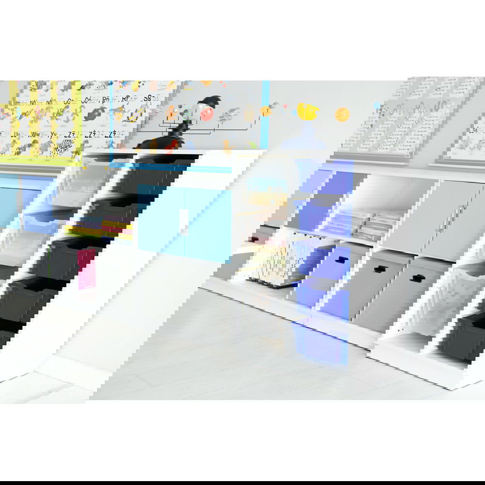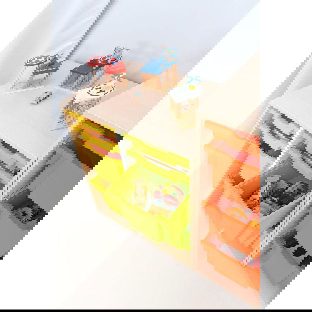 Nutzen Sie die vielfältigen Farboptionen für ein pädagogisches Ordnungssystem. Weisen Sie verschiedenen Materialarten (z. B. Bauen, Rollenspiel, Kreatives) unterschiedliche Farben zu. Das fördert die Selbstständigkeit und macht das Aufräumen für Kinder logisch und nachvollziehbar.