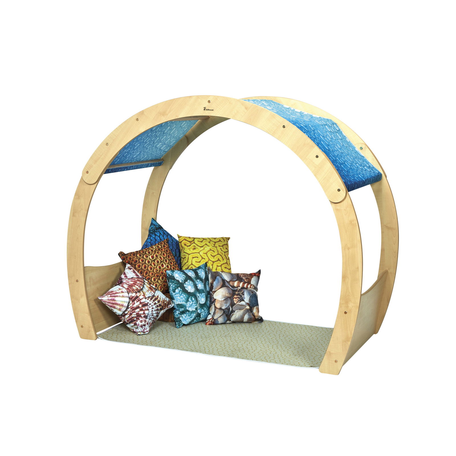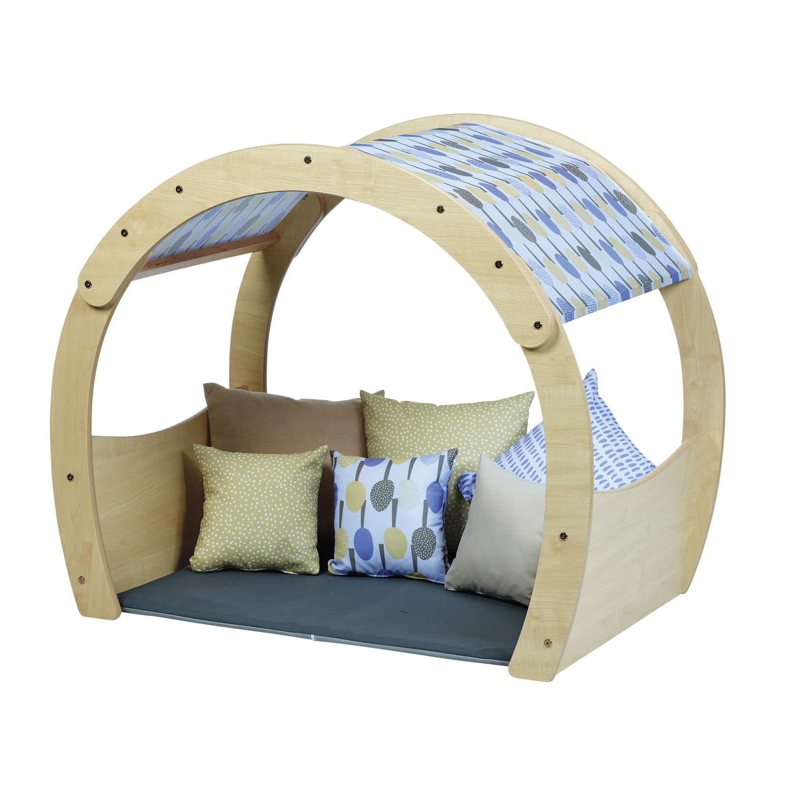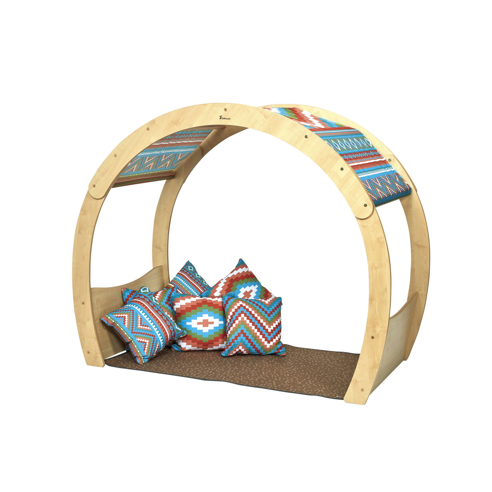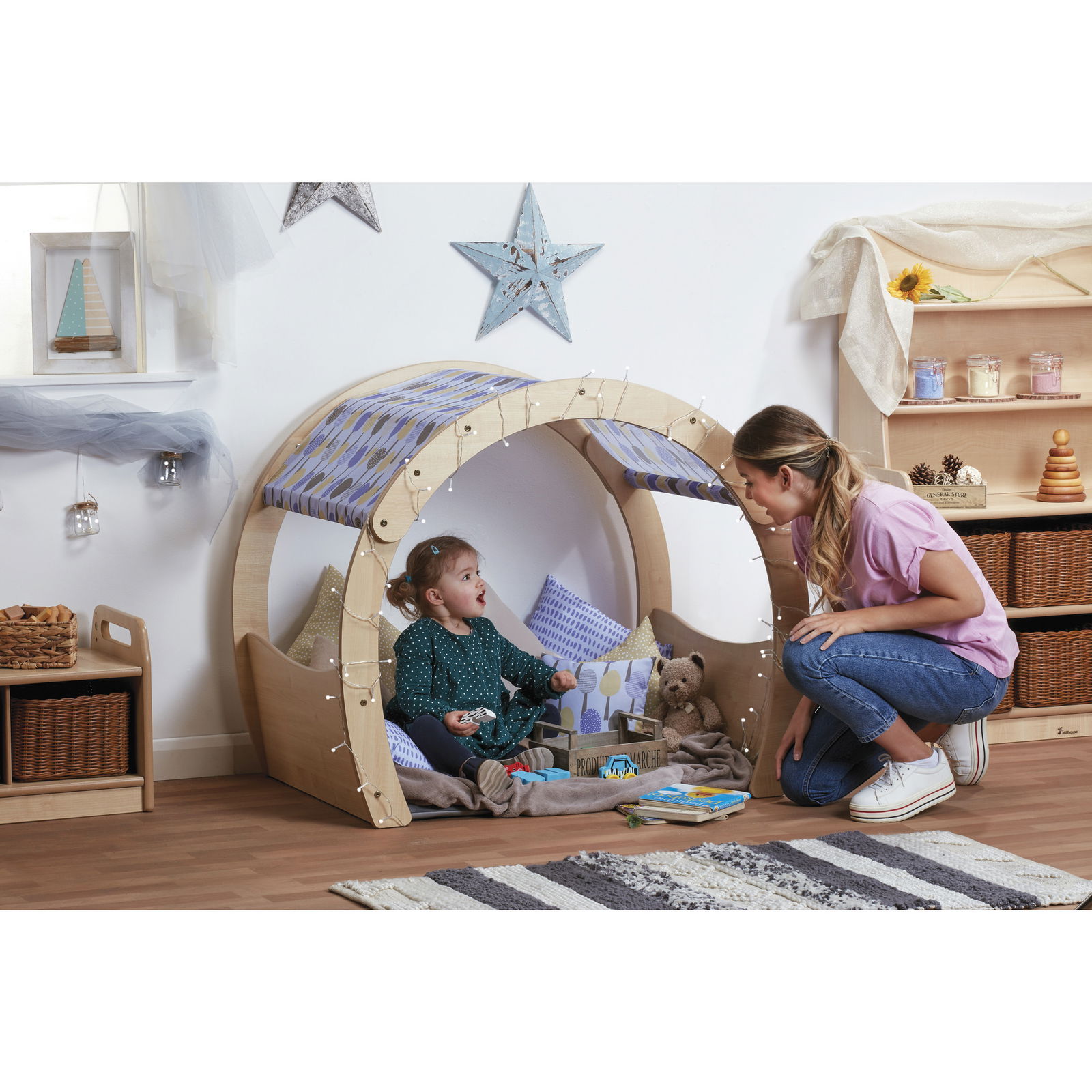 - Rückzug und Entspannung: Kinder benötigen im trubeligen Gruppenalltag Momente der Ruhe. Die höhlenartige Struktur mit dem schützenden Dach bietet eine visuelle und akustische Abschirmung, die Kindern hilft, Reize zu verarbeiten und wieder zur inneren Balance zu finden.