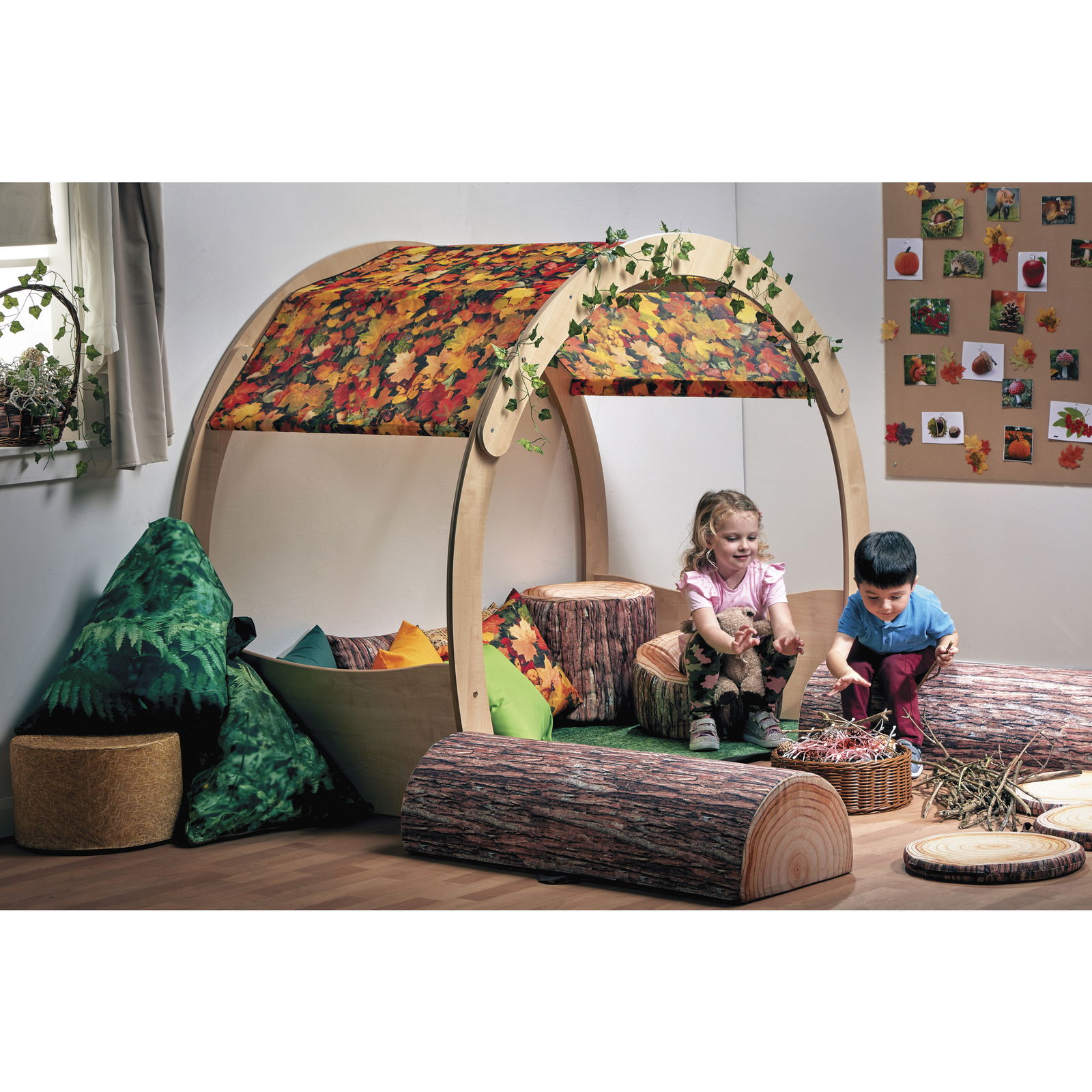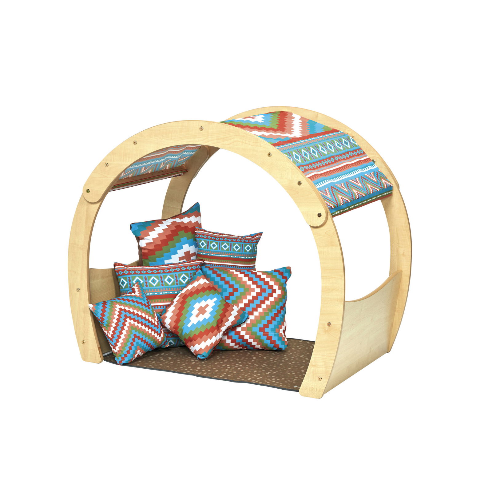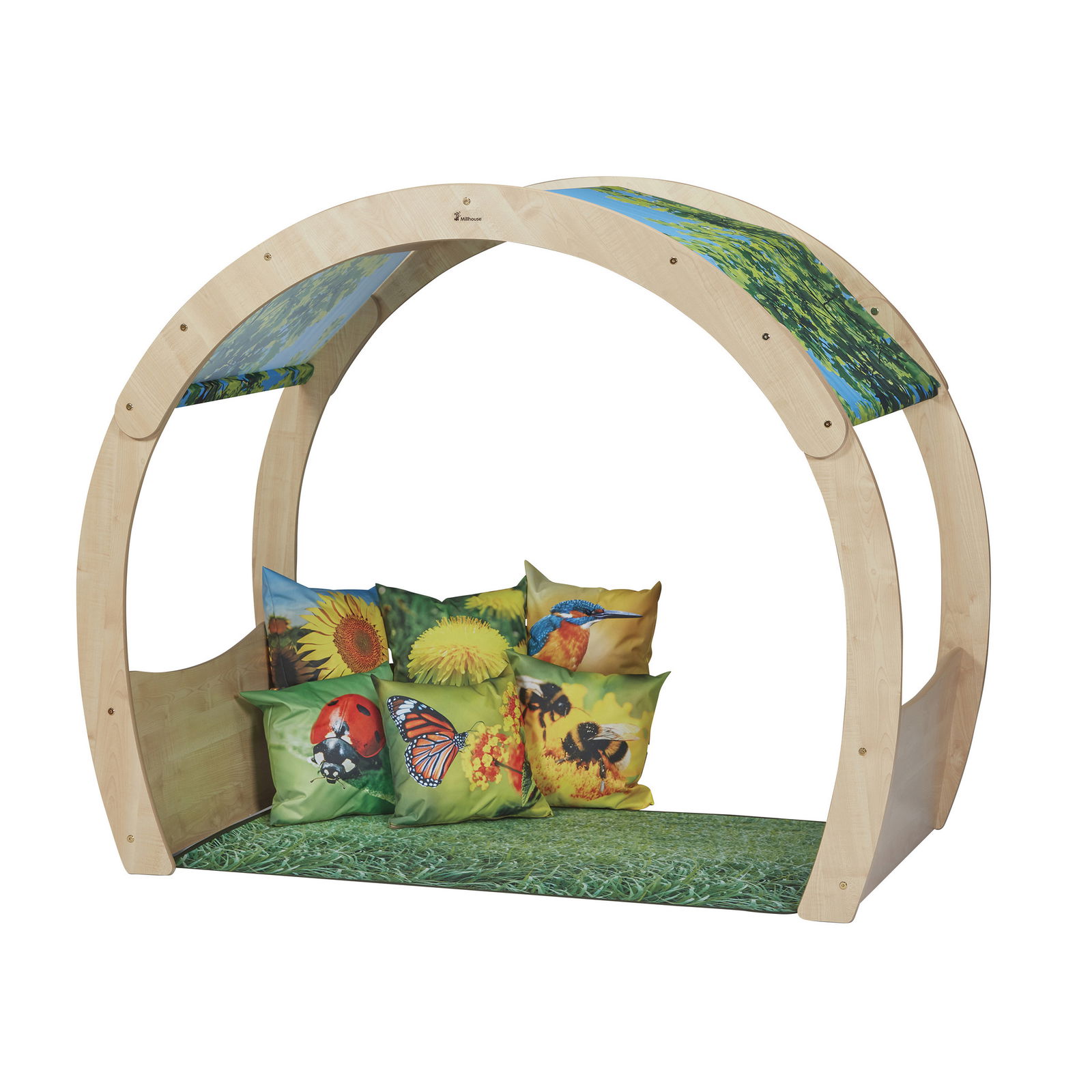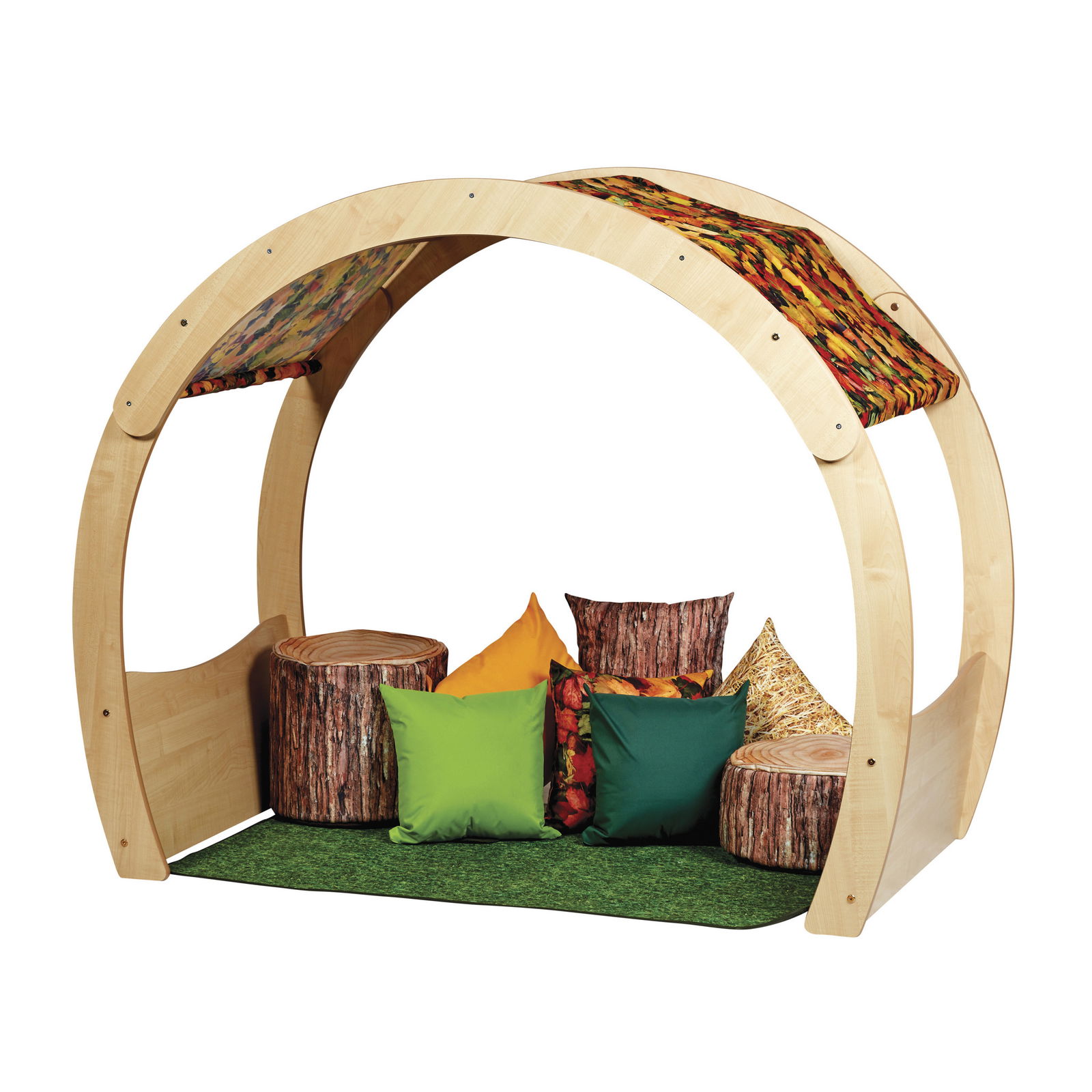 - Rückzug und Entspannung: Kinder benötigen im trubeligen Gruppenalltag Momente der Ruhe. Die höhlenartige Struktur mit dem schützenden Dach bietet eine visuelle und akustische Abschirmung, die Kindern hilft, Reize zu verarbeiten und wieder zur inneren Balance zu finden.