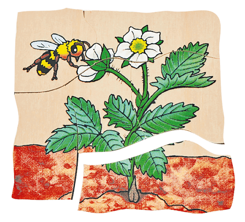 Das Lagen-Puzzle „Erdbeere“ vermittelt anschaulich und greifbar die natürliche Entwicklung, beginnend bei den ersten Keimblättern, über die Bildung der Blüte, bis zum lang erwarteten Moment, in dem aus der blühenden Pflanze eine süße, rote Erdbeere wird.