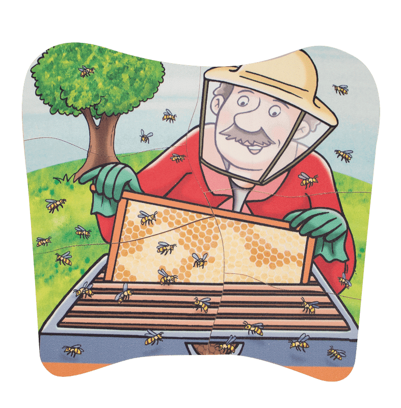 Mit diesem Puzzle lernen die kleinen Nachwuchs-Imker spielend, wie aus dem Nektar vieler Blüten durch die geschäftigen Bienen der goldene Honig wird, den wir so lieben. Sie fügen die Lagen zusammen und sehen Schicht für Schicht, wie Natur, Tier und Mensch zusammenarbeiten, um einen der süßesten Schätze der Natur zu erzeugen.