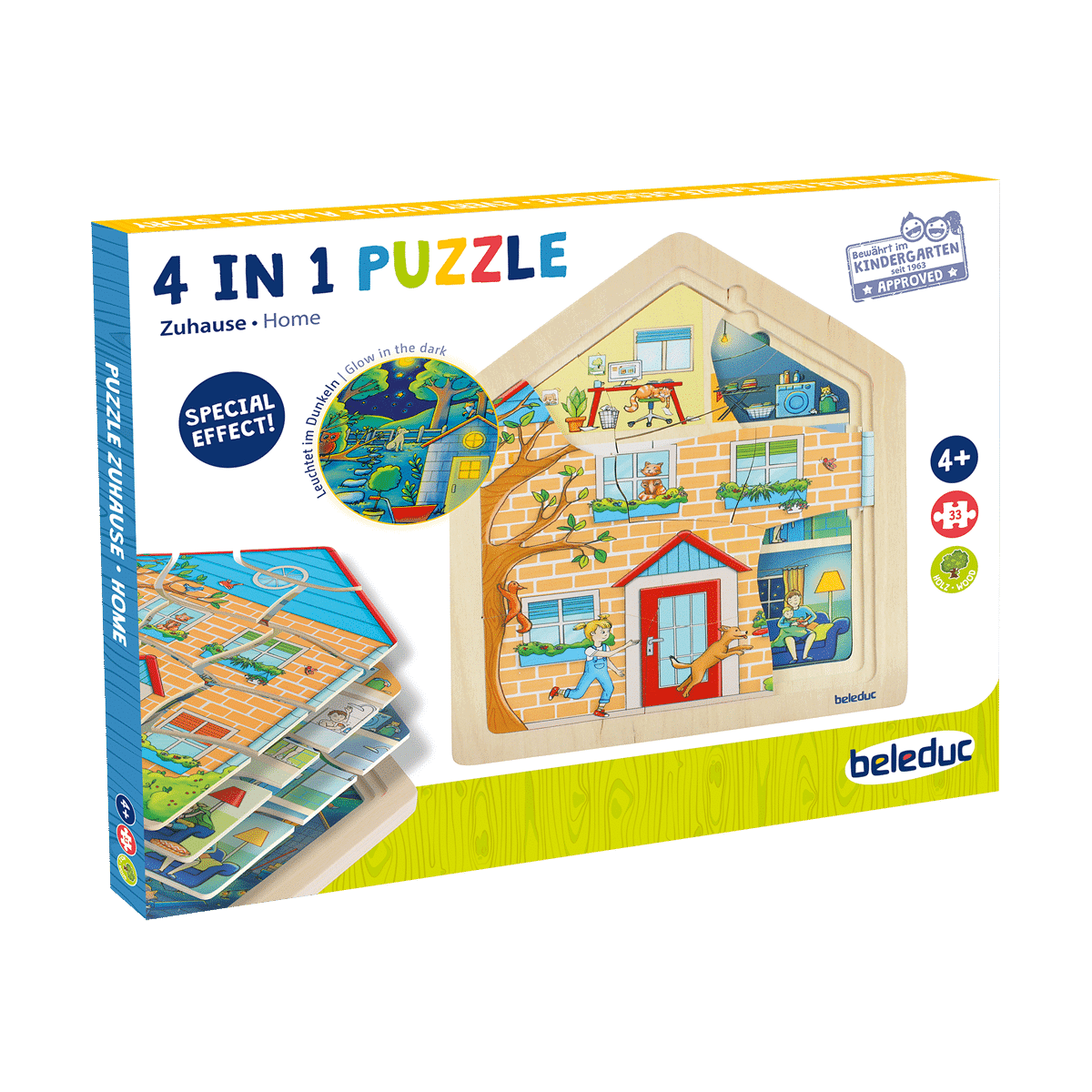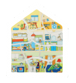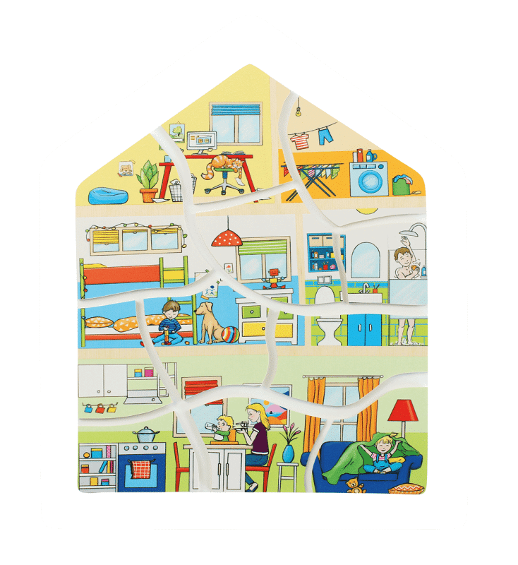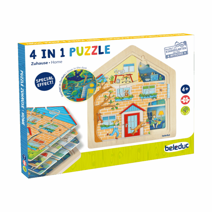 • Ein 4-in-1 Puzzle, das verschiedene Szenarien und Aktivitäten in einem Haus zu unterschiedlichen Tageszeiten nachstellt.