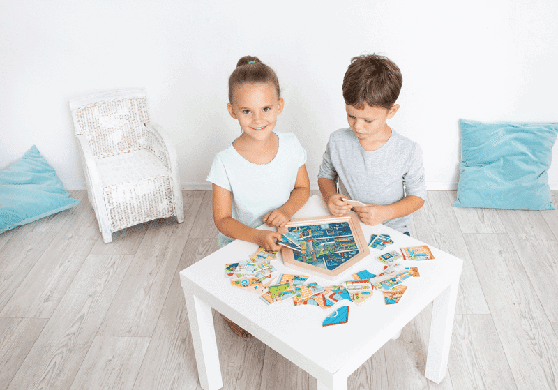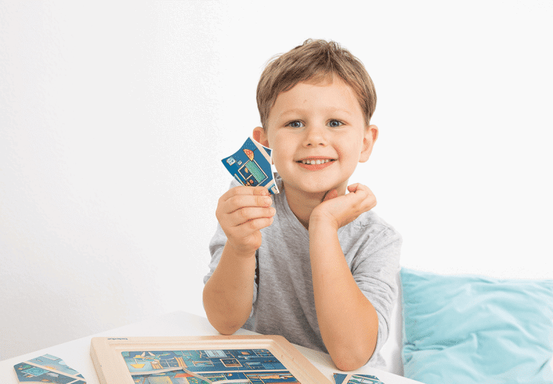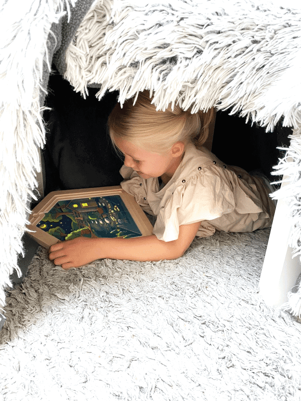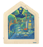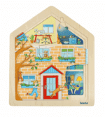 Eine interaktive Spielidee, die den Tagesablauf spannend und lehrreich in Szene setzt und durch die leuchtenden Puzzleelemente eine überraschende Komponente zum Entdecken bietet, wenn die Lichter ausgehen. Das „Zuhause“ Lagen-Puzzle schärft die Beobachtungsgabe und schenkt Kindern ein Verständnis für Familienstrukturen und Heimat.