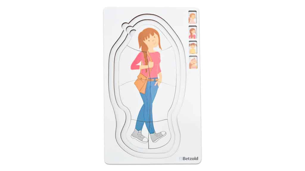 Das Lagenpuzzle zeigt die Veränderungen, die wir im Laufe unseres Lebens durchlaufen, vom Säugling bis zur älteren Person. Jede Schicht besteht aus 7 Teilen und lässt sich entweder übereinander im stabilen Puzzlerahmen anordnen oder nebeneinander auf dem Tisch puzzeln. Um den Kindern die Orientierung zu erleichtern, sind die einzelnen Lagen als Bildausschnitt an der Seite aufgezeichnet.