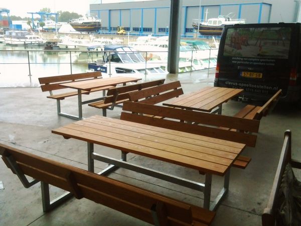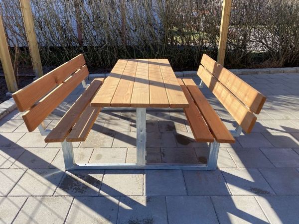 Bank mit Lehne & Tisch (Lärchenholz, verzinkt Stahl)