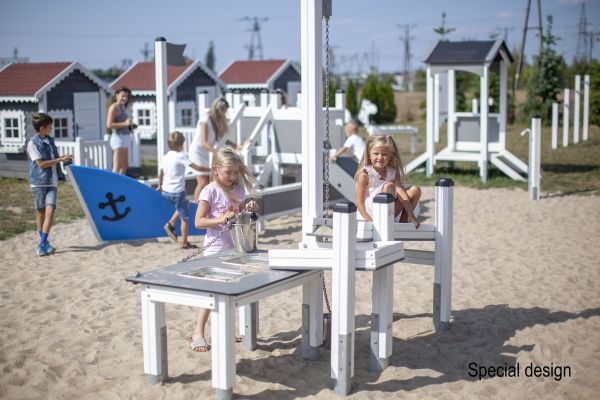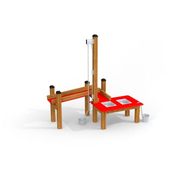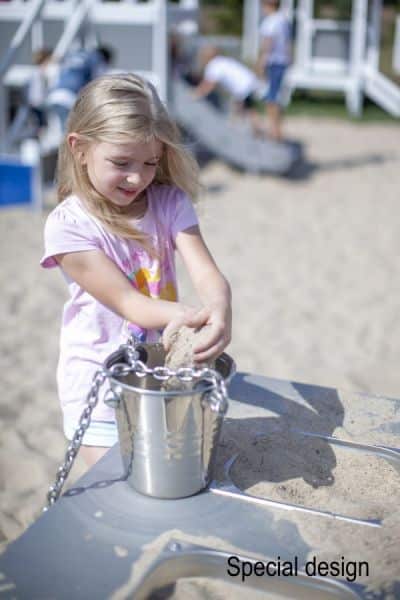 Der Sand & Matschanlage klein ist ein bemerkenswertes Produkt aus der einzigartigen Discovery Linie. Es ist ewig von Kindern Belagert auf jeden Spielplatz! Es handelt sich hier um einen Tisch der mit zwei Metallbehältern und einem Sandaufzug ausgestattet ist. Dieses Spielplatzgerät ist ein Qualitätsprodukt, aus sehr haltbaren Holz und verzinktem Metall. Es ist geeignet für Kinder ab zwei Jahren. Fallschutz für dieses Produkt ist erforderlich.