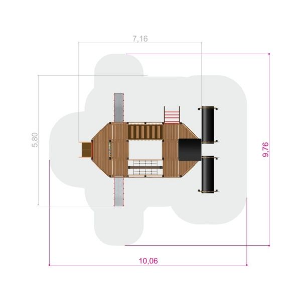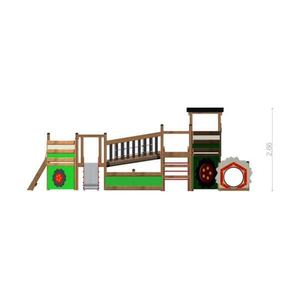 - Grundmaterial: Holz: Lärche, Edelstahl, pulverbeschichteter Stahl, verstärktes Polypropylenseil, Plastisol beschichtetes Stahlblech, Wasserdichtes Sperrholz, HDPE, PE / Plastic