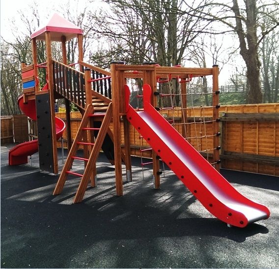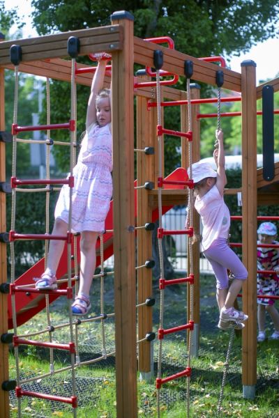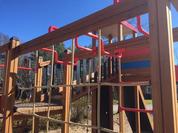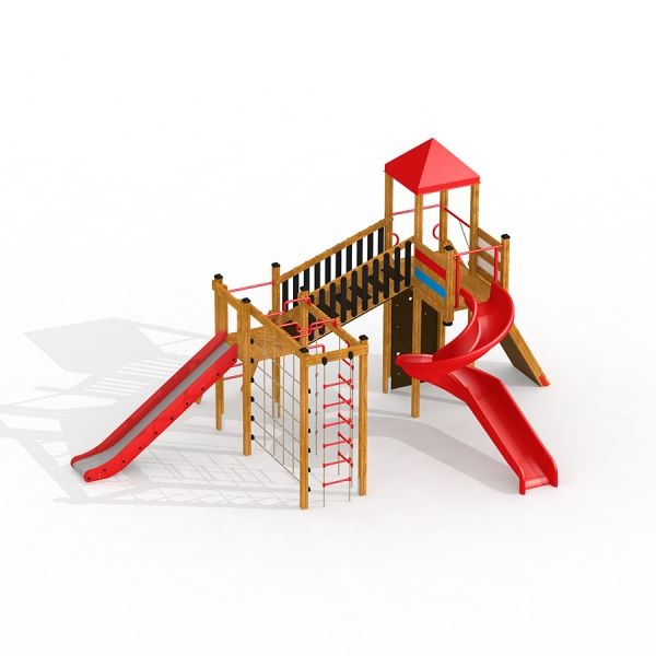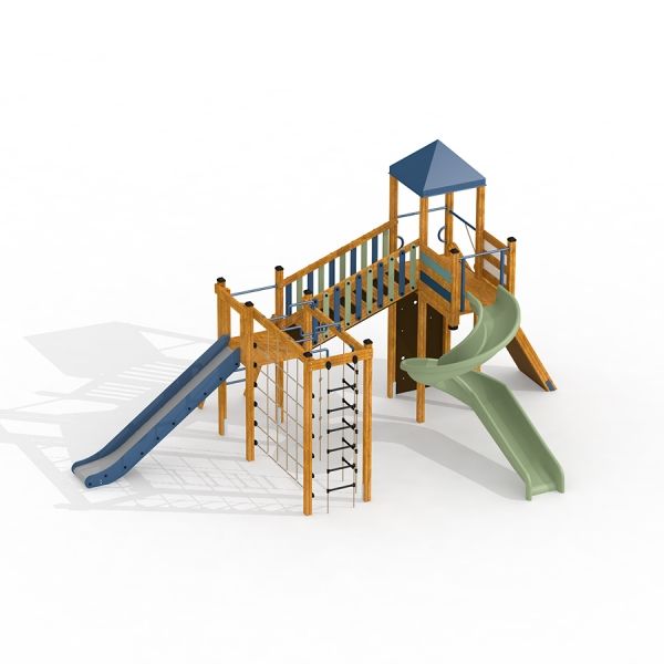 - Material: Lärchenholz, Edelstahl, pulverbeschichteter Stahl, PP (Reinforced ropes, Soft rope), Fiberglas, plastikbeschichtete Stahlplatten, rutschfester, wasserdichter Sperrholz, HDPE