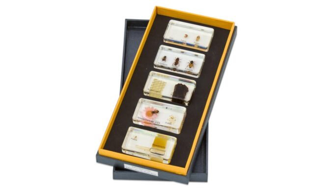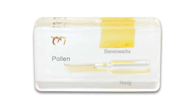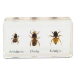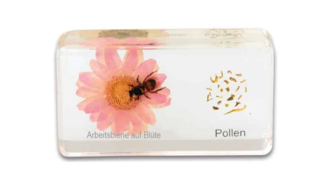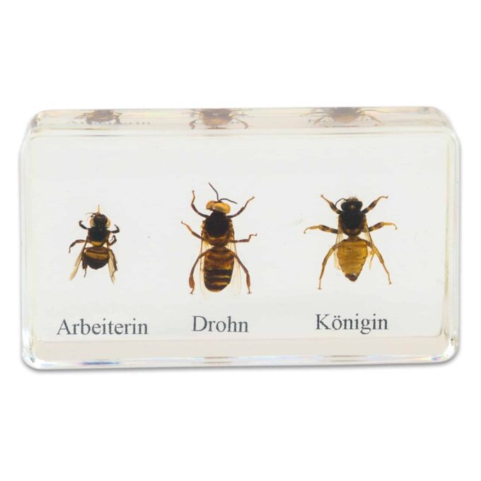 Insgesamt 5 unzerbrechliche Kunstglasblöcke zeigen anschaulich den Lebenszyklus der Honigbiene. Die Kinder können die verschiedenen Stadien, von der Larve über die Puppe bis hin zu den unterschiedlichen Bienentypen – Drohn, Arbeiterin und Königin – von allen Seiten betrachten. Diese detailreichen Einschlüsse bieten zahlreiche Lernimpulse: Es ist besonders interessant zu beobachten, welche Grundstrukturen die Biene hat, oder die gefüllte Bienenwabe, Pollen, Bienenwachs und Honig zu entdecken.