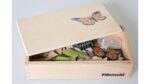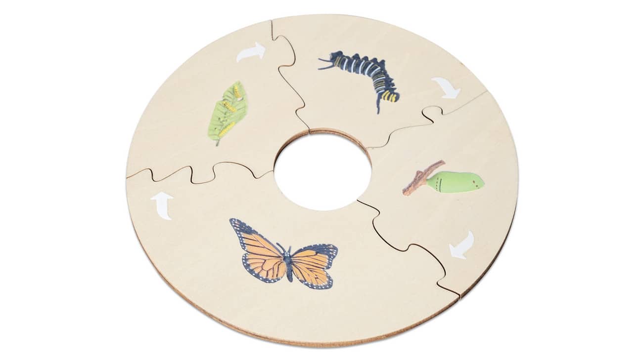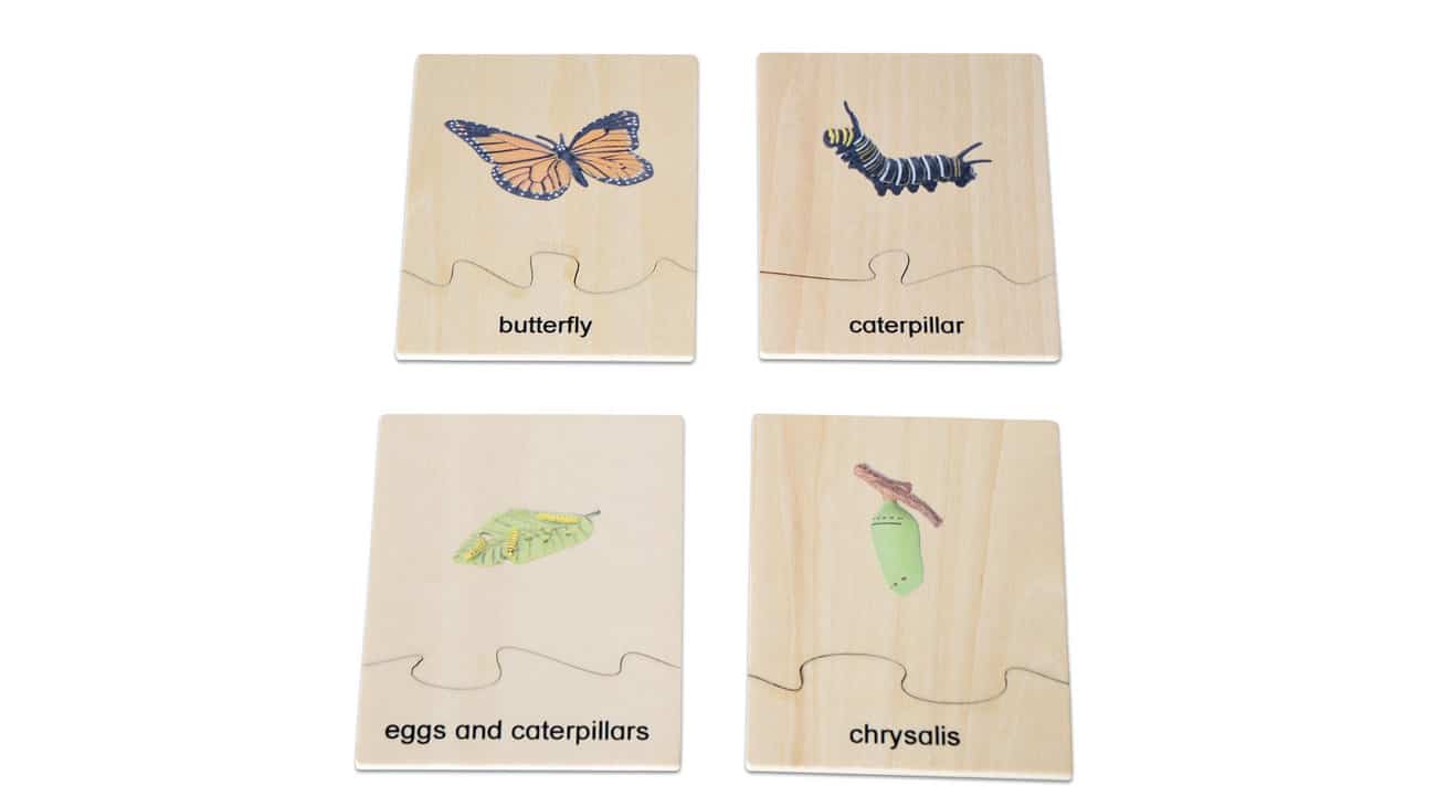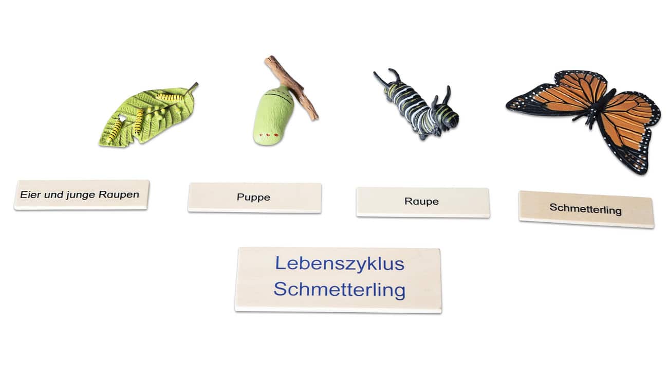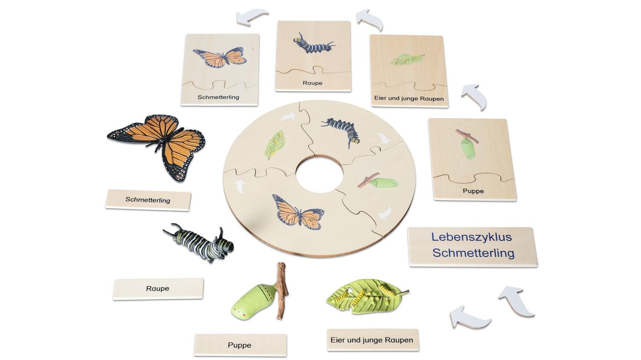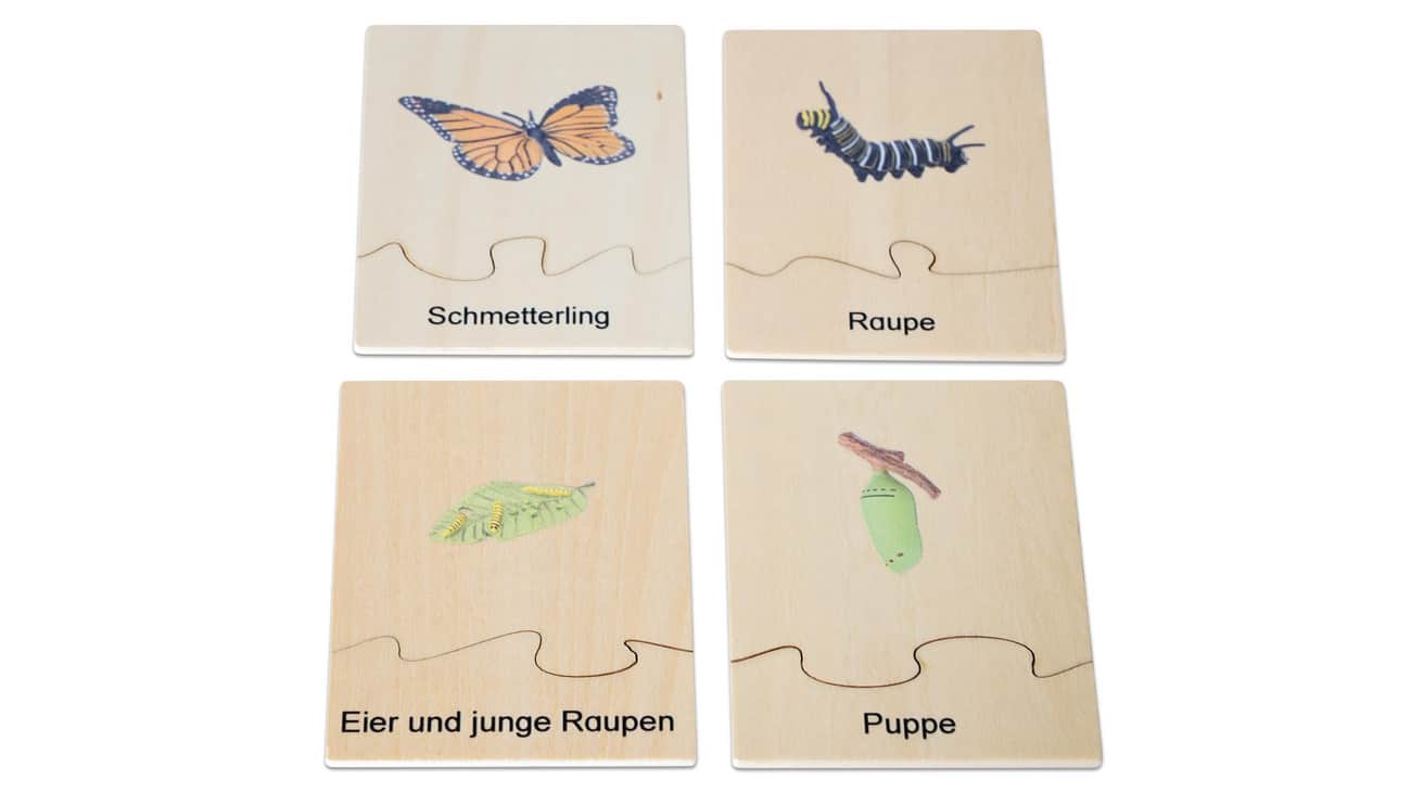 Die 4 abwaschbaren Kunststofffiguren im Set ermöglichen den Kindern eine detaillierte Betrachtung der verschiedenen Lebensstadien. In der stabilen Aufbewahrungsbox aus Holz sind die Figuren bestens verstaut und bereit für spannende Entdeckungsreisen. Die beiden Holzpuzzles zeigen die einzelnen Entwicklungsphasen des Schmetterlings und sind zweisprachig (Deutsch und Englisch) beschriftet, um das Sprachverständnis spielerisch zu fördern.