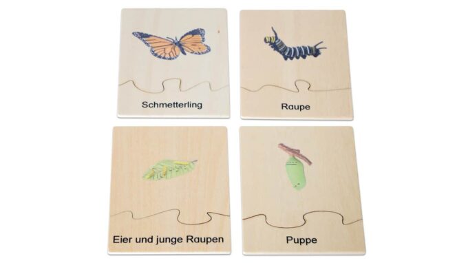 Die 4 abwaschbaren Kunststofffiguren im Set ermöglichen den Kindern eine detaillierte Betrachtung der verschiedenen Lebensstadien. In der stabilen Aufbewahrungsbox aus Holz sind die Figuren bestens verstaut und bereit für spannende Entdeckungsreisen. Die beiden Holzpuzzles zeigen die einzelnen Entwicklungsphasen des Schmetterlings und sind zweisprachig (Deutsch und Englisch) beschriftet, um das Sprachverständnis spielerisch zu fördern.