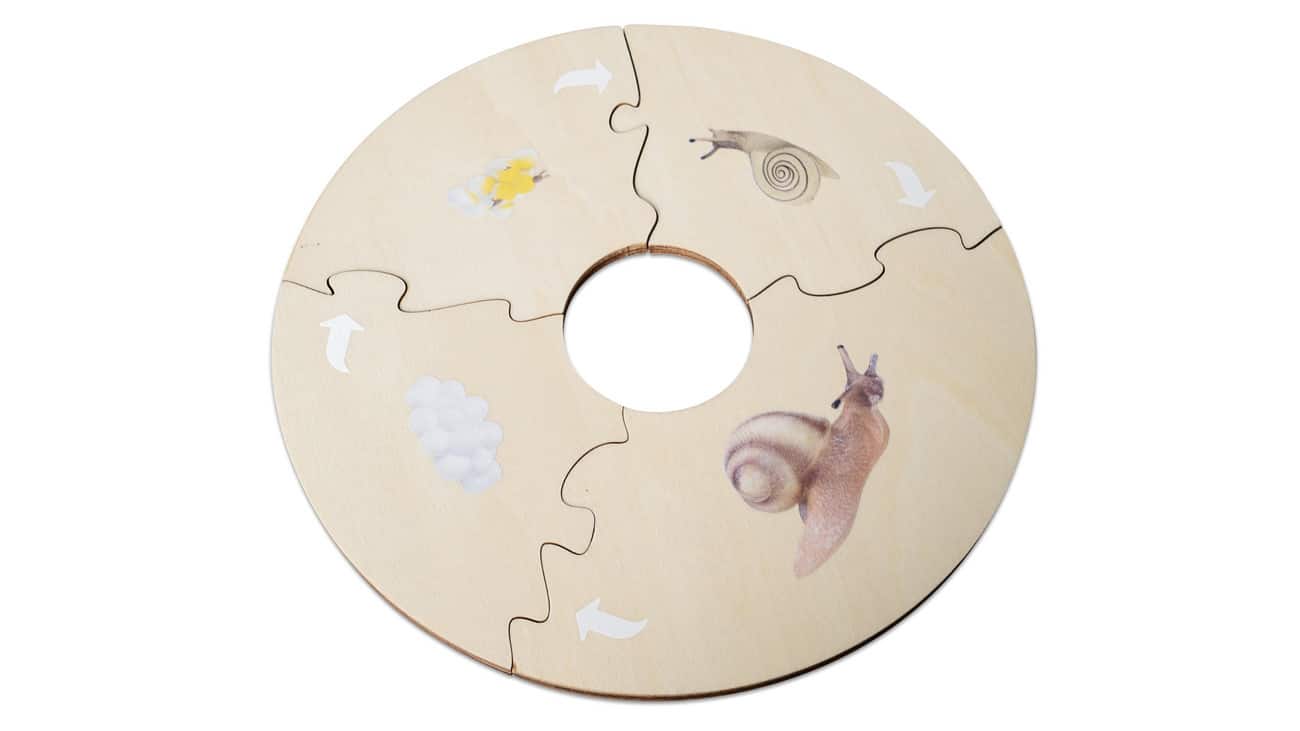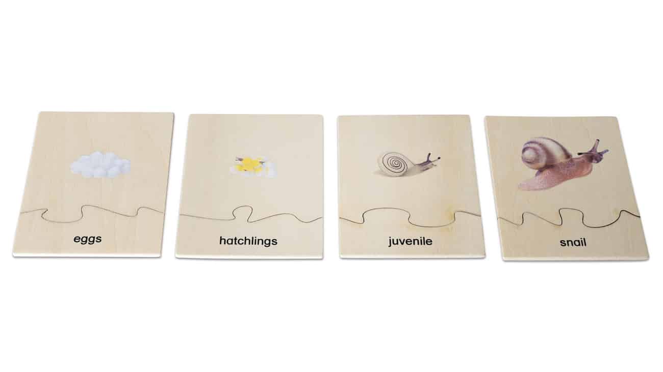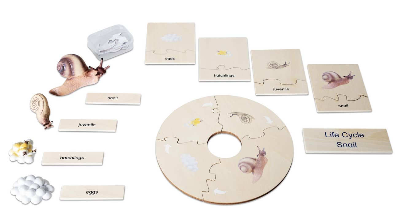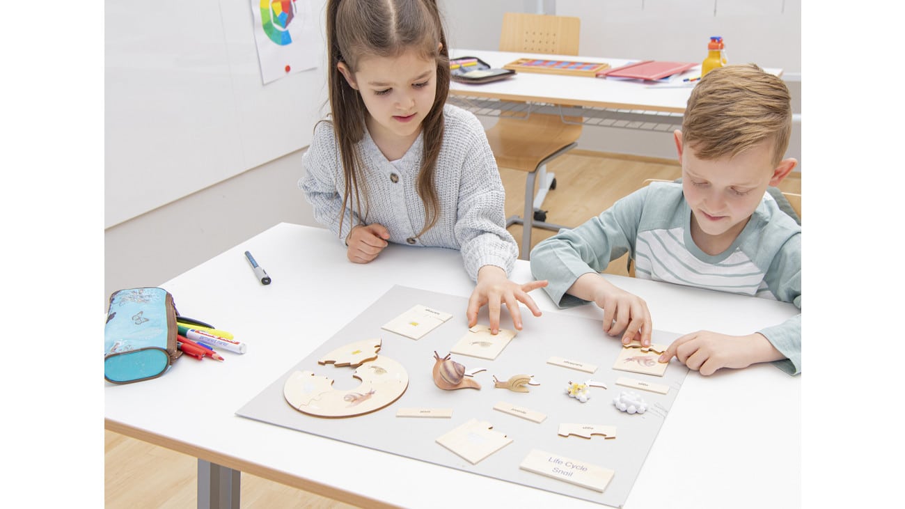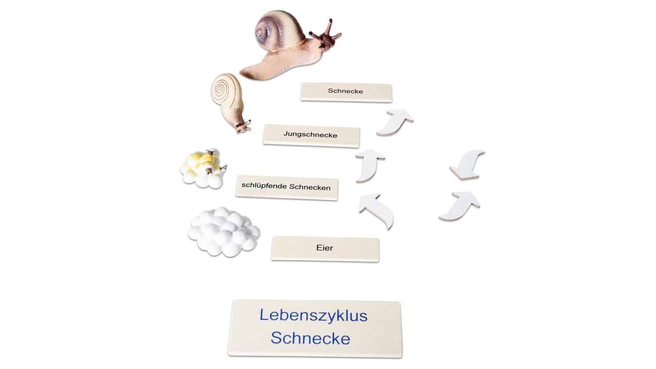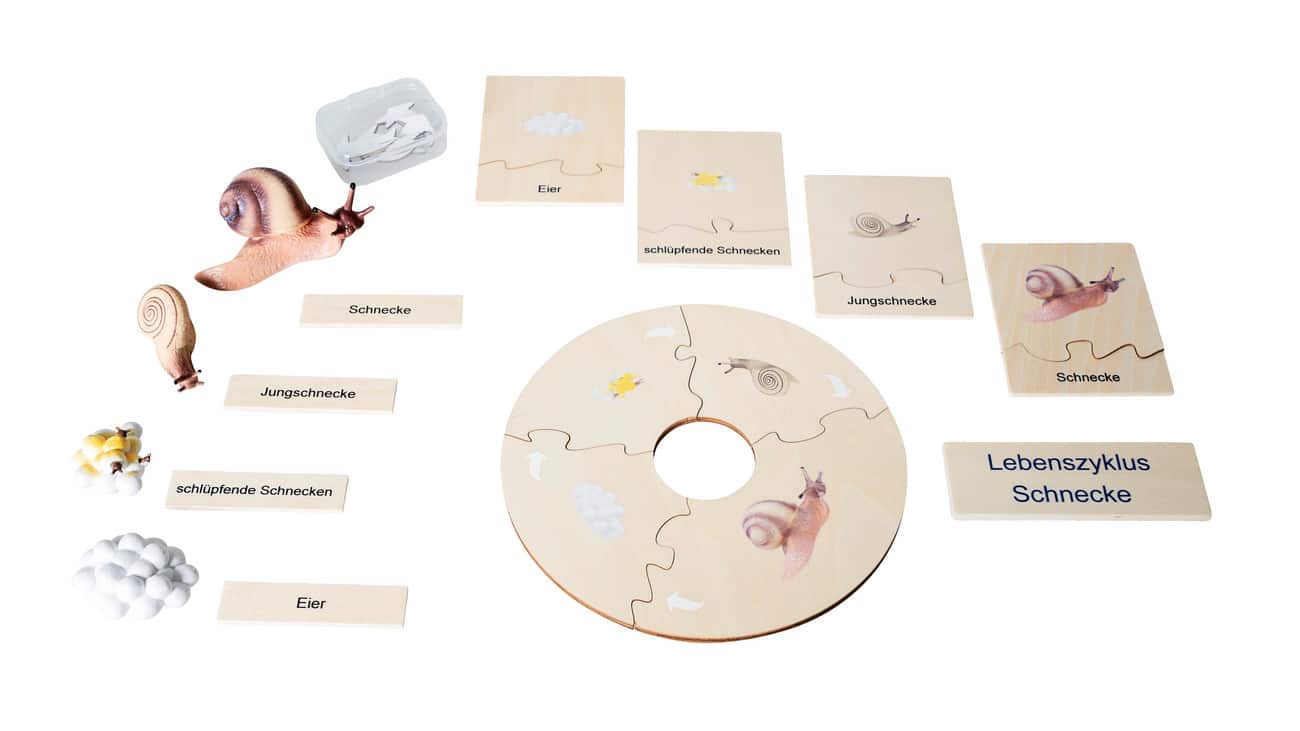 Im Set finden Sie 4 Kunststofffiguren, die die verschiedenen Lebensphasen der Schnecke darstellen. Diese sind ideal zum Anfassen und ermöglichen den Kindern, die Entwicklung hautnah zu erleben. Ergänzend dazu bekommen die Lernenden zwei Holzpuzzles, die den Lebenszyklus der Schnecke mit klaren Illustrationen und zweisprachigen Beschriftungen in Deutsch und Englisch zeigen.