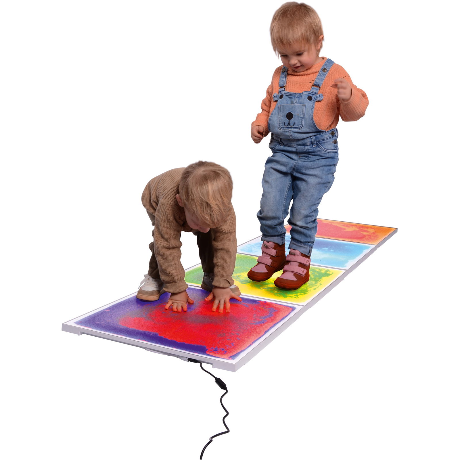 Ein besonderer Vorteil ist die einfache Handhabung: Die vier Platten können in einer Reihe miteinander verbunden werden. Dank dieses cleveren Systems wird nur ein einziger Stromanschluss für den gesamten, zwei Meter langen Lichtpfad benötigt. Mit einer Belastbarkeit von bis zu 80 kg pro Platte und einer robusten Kunststoffoberfläche sind sie für den anspruchsvollen Alltag in Kitas und Therapieräumen bestens gerüstet.