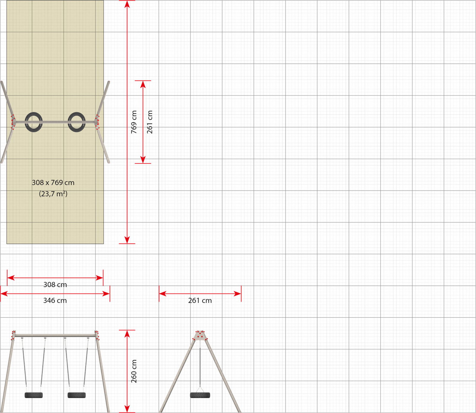 - Platzbedarf inkl. Sicherheitsabstände (LxB): 346 x 769 cm