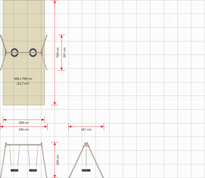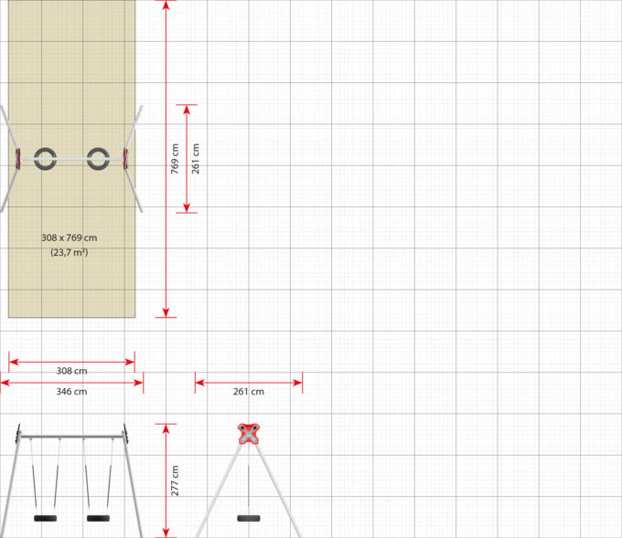 - Platzbedarf inkl. Sicherheitsabstände (LxB): 346 x 769 cm