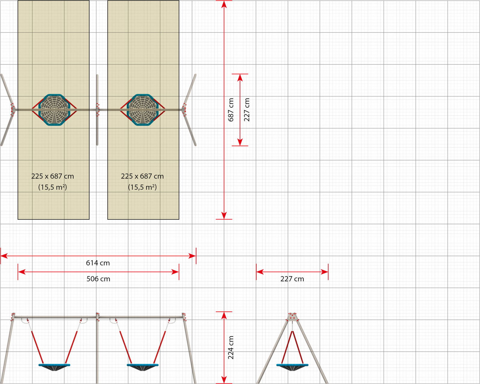 - Platzbedarf inkl. Sicherheitsabstände (LxB): 614 x 687 cm