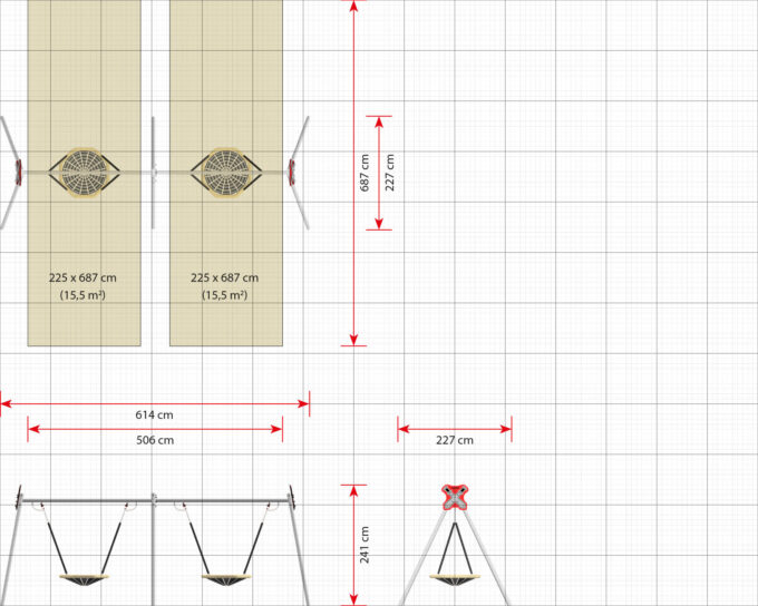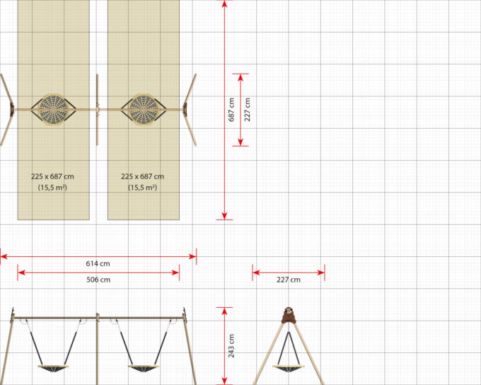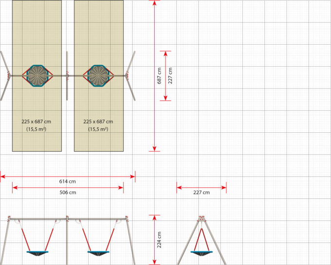 - Platzbedarf inkl. Sicherheitsabstände (LxB): 614 x 687 cm