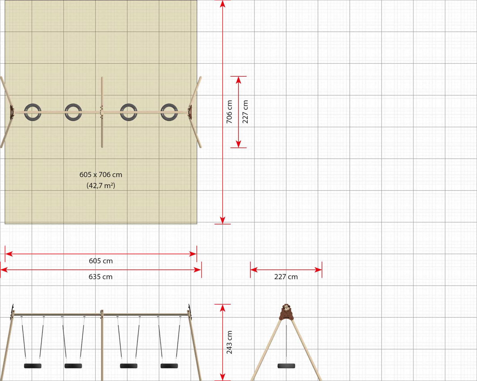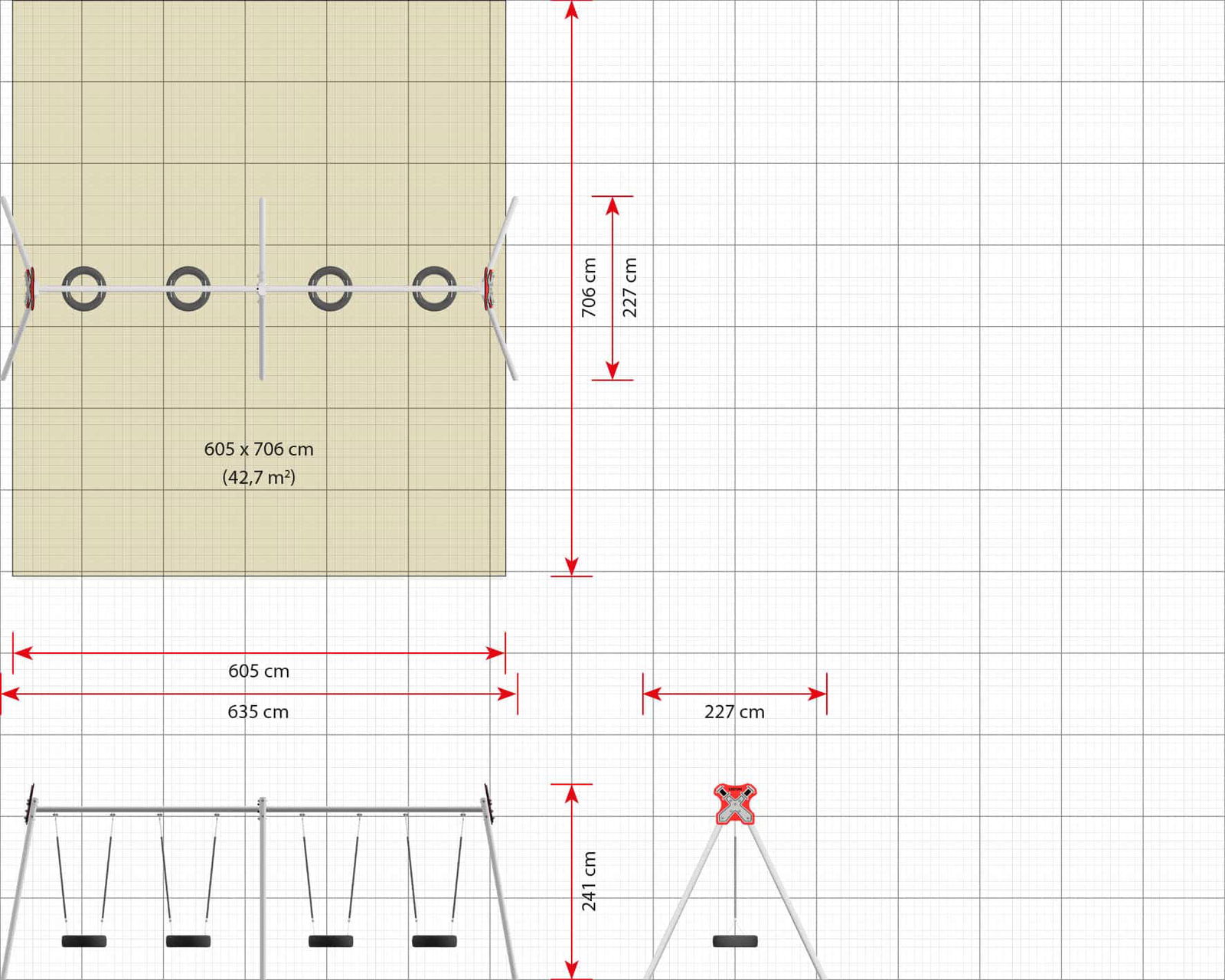 - Platzbedarf inkl. Sicherheitsabstände (LxB): 635 x 706 cm