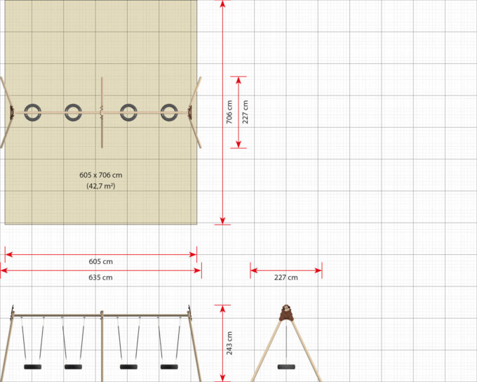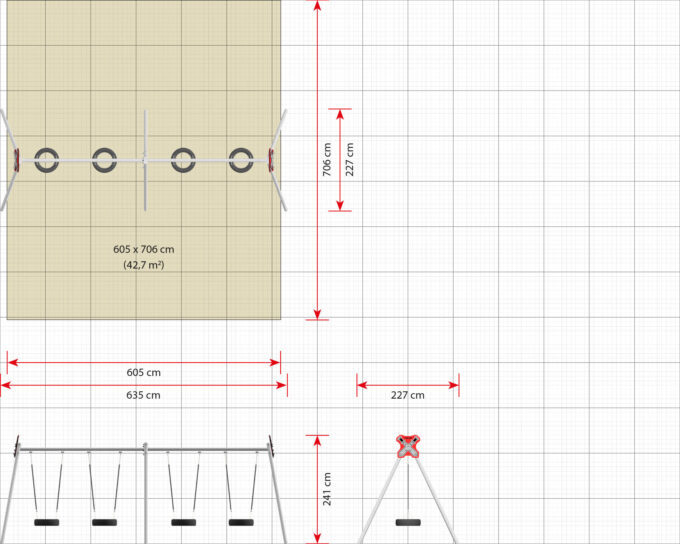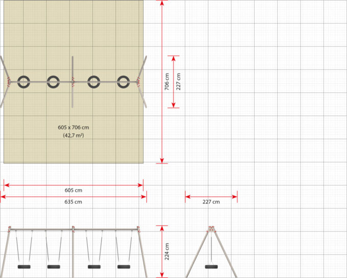 - Platzbedarf inkl. Sicherheitsabstände (LxB): 635 x 706 cm