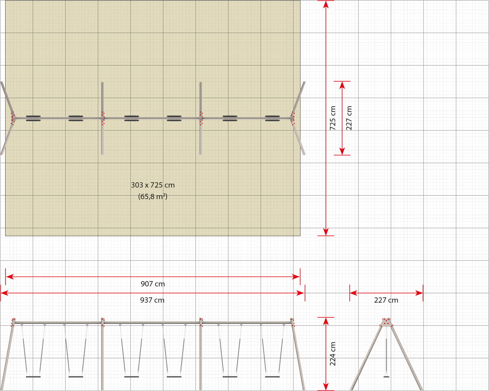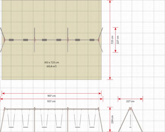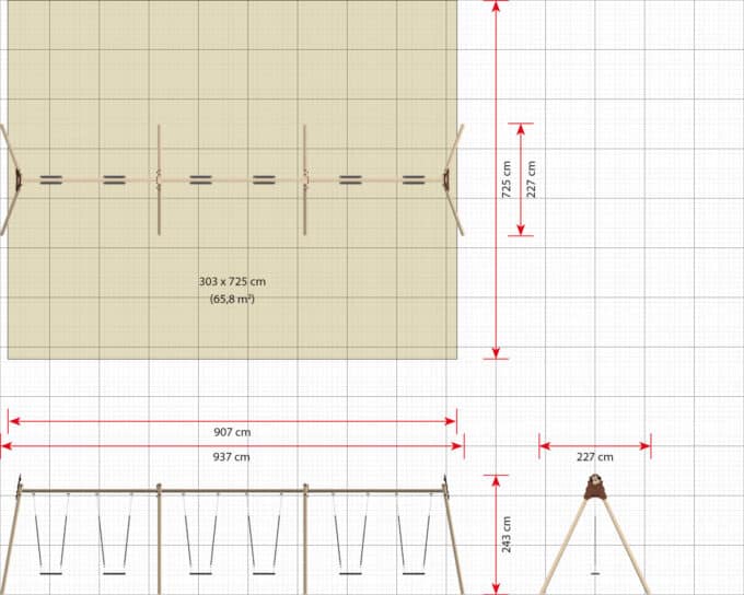 - Platzbedarf inkl. Sicherheitsabstände (LxB): 937 x 725 cm