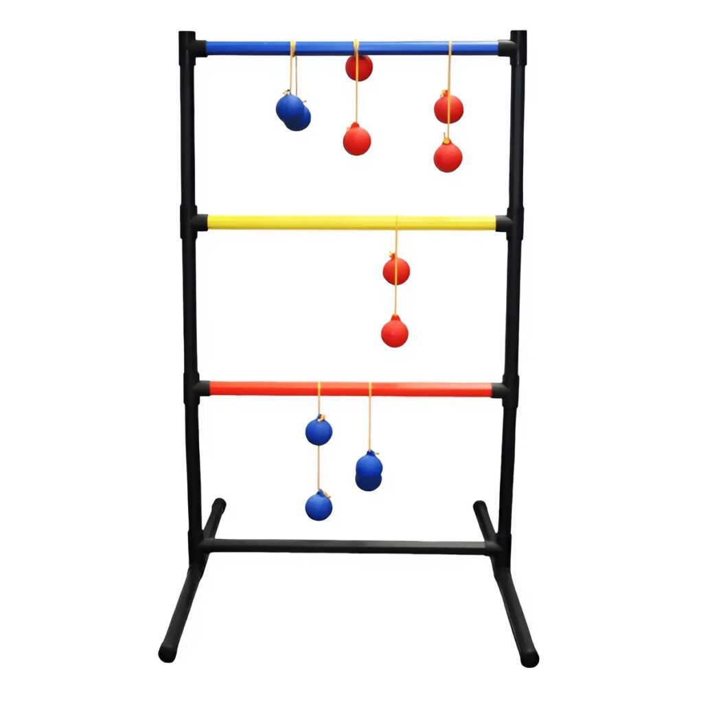 Dabei ist Fingerspitzengefühl gefragt! Stellen Sie sich etwa drei Meter entfernt auf, fixieren Sie das Ziel und lassen Sie die Doppelkugeln fliegen. Der Moment, in dem sich das Seil um die Stange schlingt und dort hängen bleibt, sorgt garantiert für Jubel. Ob als spannendes Duell zwischen zwei Spielern oder als unterhaltsames Turnierspiel auf dem nächsten Sommerfest: Leiter Golf weckt den sportlichen Ehrgeiz und sorgt für unzählige Erfolgserlebnisse. Dank der robusten Bauweise und der standfesten Konstruktion steht dem Spielvergnügen nichts im Wege.