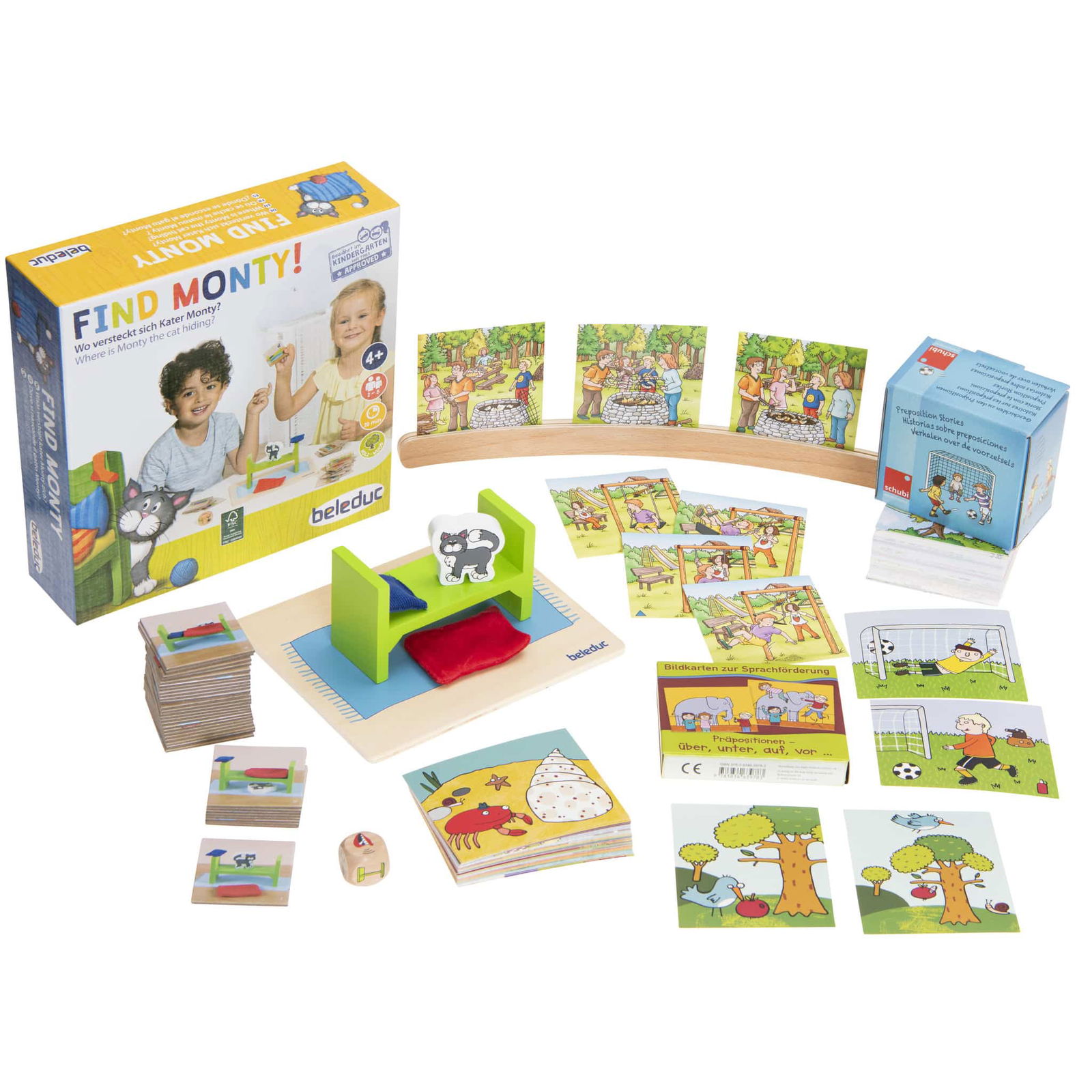 Das Set enthält verschiedene Materialien, die sowohl die visuelle als auch die auditive Wahrnehmung der Kinder ansprechen. Durch das Spiel „Find Monty“ werden die Kinder nicht nur in die einzelnen Präpositionen eingeführt, sondern üben auch gezielt deren Anwendung in verschiedenen Kontexten. Die Bildkarten helfen den Kindern, die Begriffe anschaulich zu verinnerlichen. Sie fördern die Benennung von Ortsangaben und unterstützen beim Plural sowie beim sinnentnehmenden Hören.