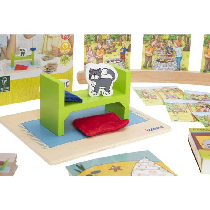 - Visuelle Wahrnehmung: Bildkarten und Geschichten zu den Präpositionen unterstützen die Kinder beim Erkennen und Benennen von Raum-Lage-Bezügen.