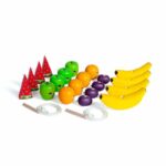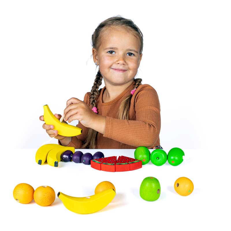 Mit 20 Fädelfrüchten aus Holz – darunter 4 Bananen, 4 Äpfel, 4 Orangen, 4 Melonenstücke und 4 Pflaumen – bietet das Set eine Vielzahl von fröhlichen Farben und Formen. Die beiliegenden 2 Fädelnadeln aus Holz und eine Kunststoffschnur ermöglichen es den Kindern, die Früchte aufzufädeln und so wunderschöne Ketten oder kreative Designs zu gestalten.