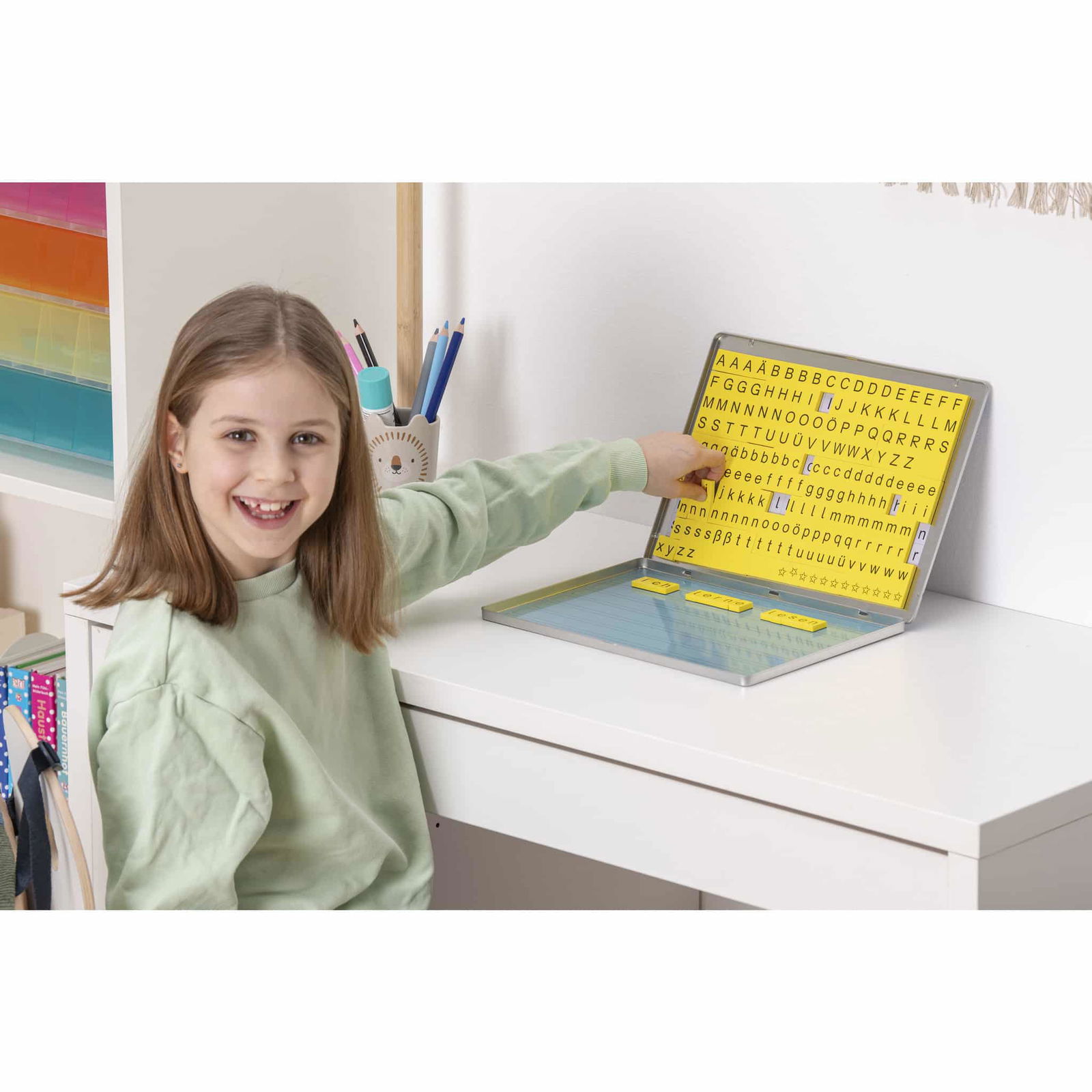 Der hohe Aufforderungscharakter der Buchstabenblöcke sorgt dafür, dass die Kinder motiviert sind, eigene Texte zu erstellen sowie ihr Leseverstehen zu vertiefen. Das Lernen mit der Lese-Magnetbox fördert nicht nur die Lese- und Schreibkompetenz, sondern schärft auch die Konzentrationsfähigkeit und das eigenverantwortliche Arbeiten.