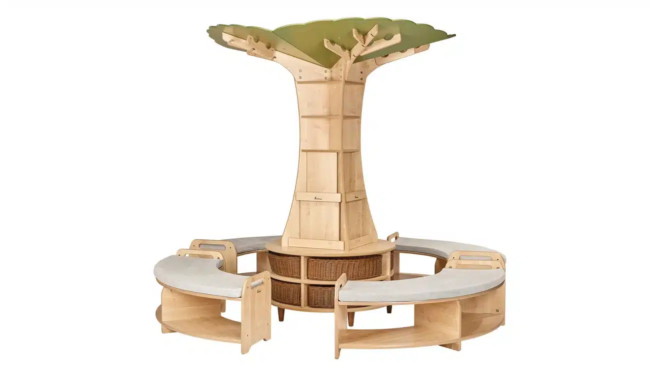 - Wahlweise mit Sitzmöglichkeiten: Je nach Platzangebot und Bedarf ist der Baum pur als Regal-Lösung oder als komplettes Set mit vier passenden Sitzbänken inklusive abwischbarer Polster erhältlich. So entsteht eine runde Sitzlandschaft für die ganze Gruppe.