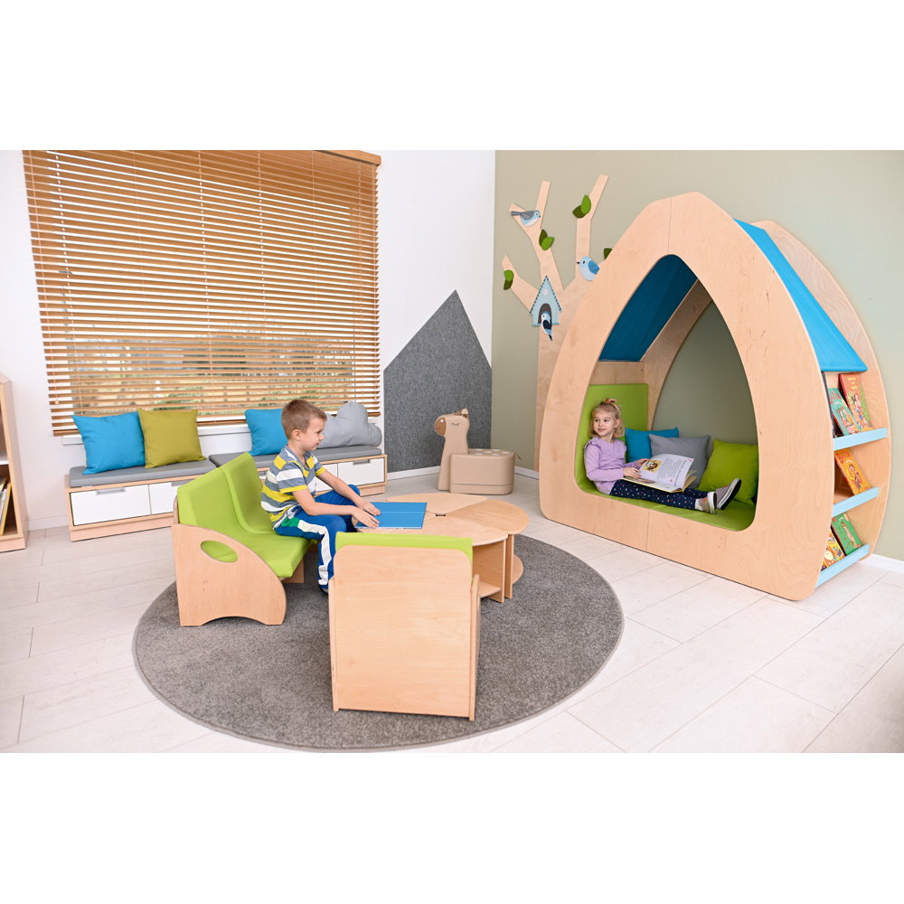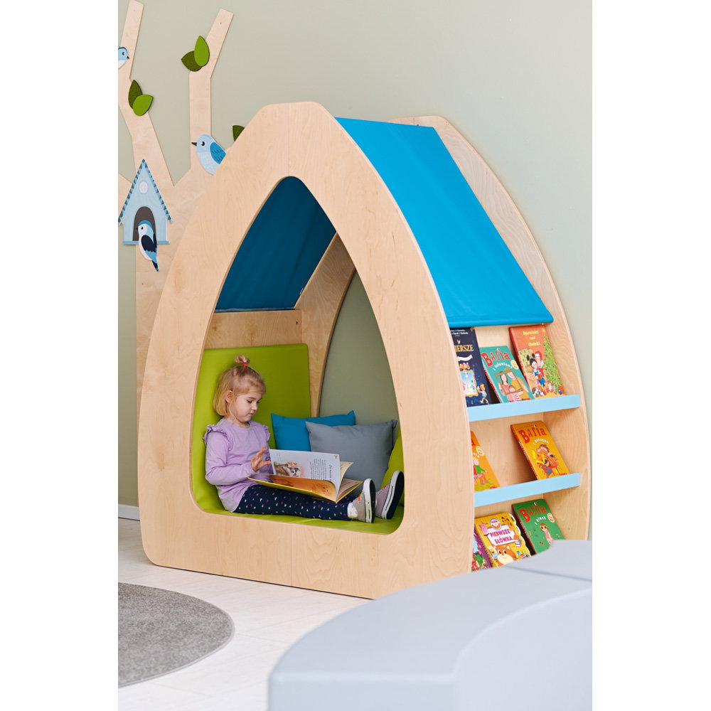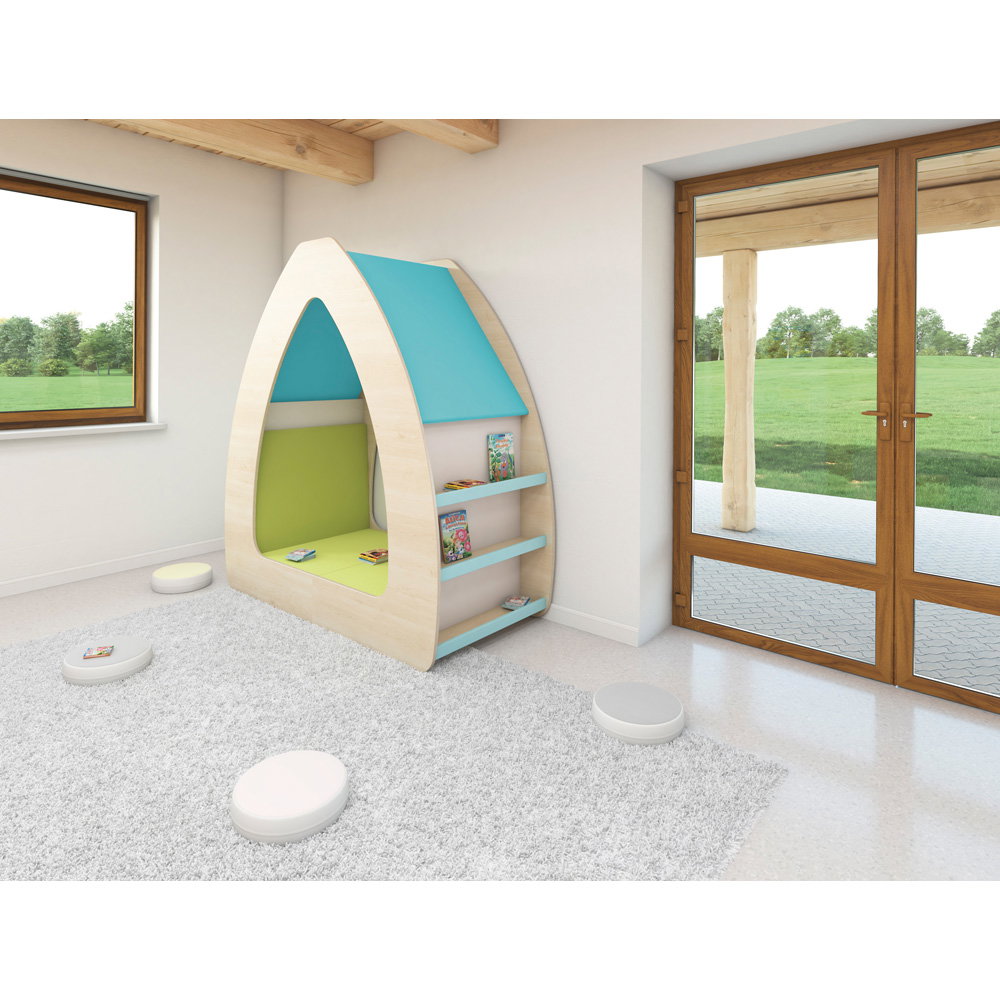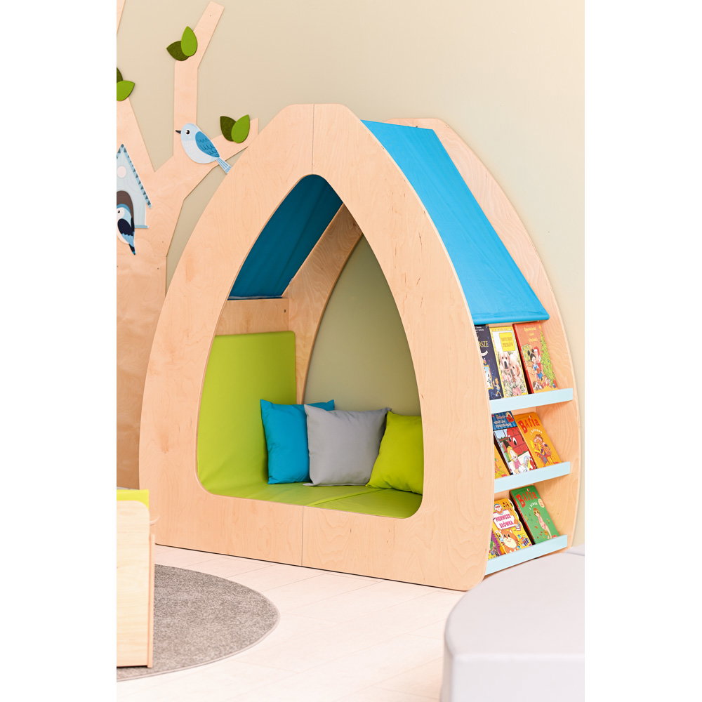 Ein besonderes Highlight ist die clevere Integration von Stauraum. An beiden Außenwänden befinden sich jeweils drei praktische Bücherablagen. Hier finden Lieblingsbücher, Bildergeschichten und Magazine ihren Platz – immer griffbereit für die nächste Lese-Session. So wird die Oase nicht nur zum Ruheort, sondern auch zu einer kleinen, eigenständigen Bibliothek. Kinder lernen spielerisch, ihre Bücher selbst auszuwählen und wieder an ihren Platz zu legen. Mit großzügigen Maßen bietet das Haus ausreichend Platz für mehrere Kinder, die gemeinsam lesen oder leise spielen möchten, ohne sich eingeengt zu fühlen.