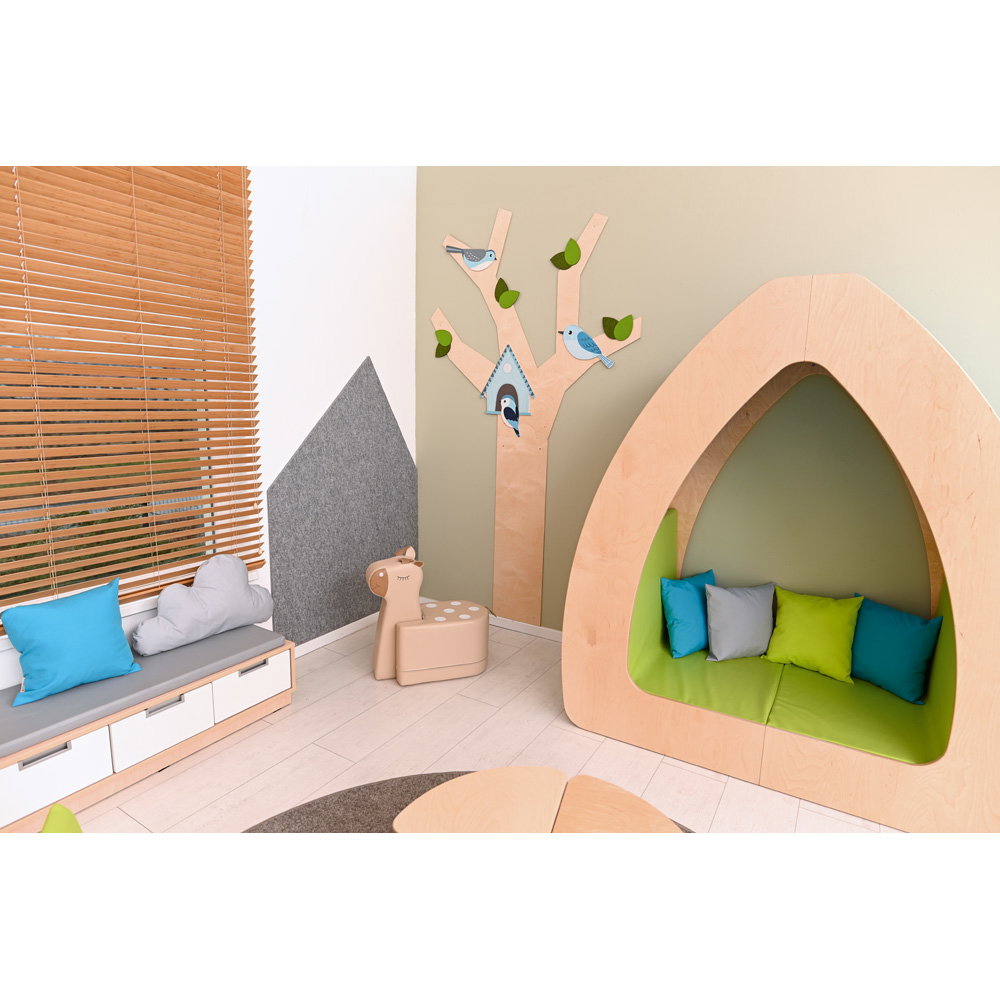 Das Design der Oase ist bis ins Detail durchdacht. Das stabile Gestell aus hochwertig lackiertem Sperrholz bildet eine sichere und langlebige Grundstruktur. Im Inneren erwartet die Kinder eine weiche, einladende Landschaft: Boden und Wände sind mit komfortablen Matten in einem beruhigenden Grünton gepolstert. Diese bestehen aus formstabilem Schaumstoff, der mit einem strapazierfähigen und pflegeleichten Kunstlederbezug versehen ist. Flecken oder kleine Missgeschicke lassen sich so im Handumdrehen beseitigen. Das abnehmbare Textildach spendet sanftes Licht und verstärkt das Gefühl, in einer eigenen kleinen Höhle zu sein.