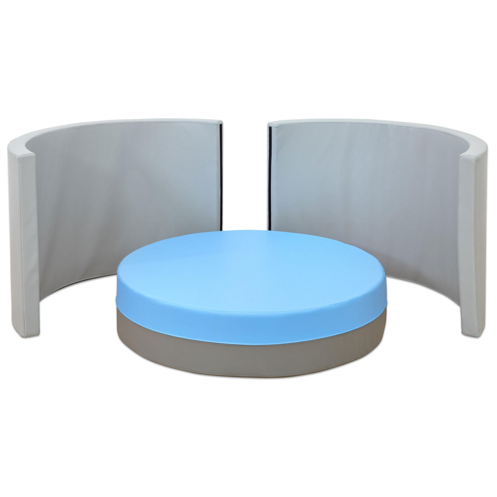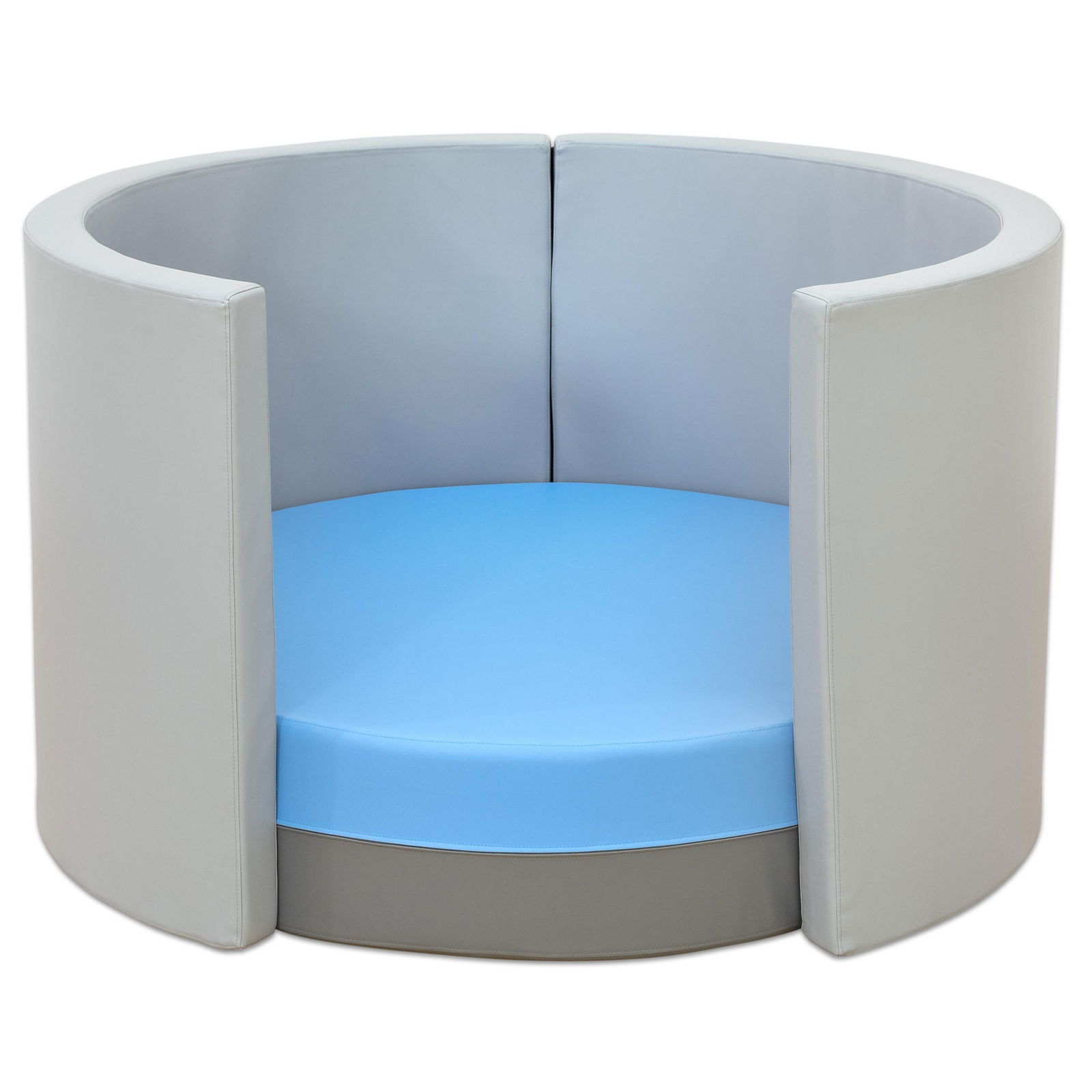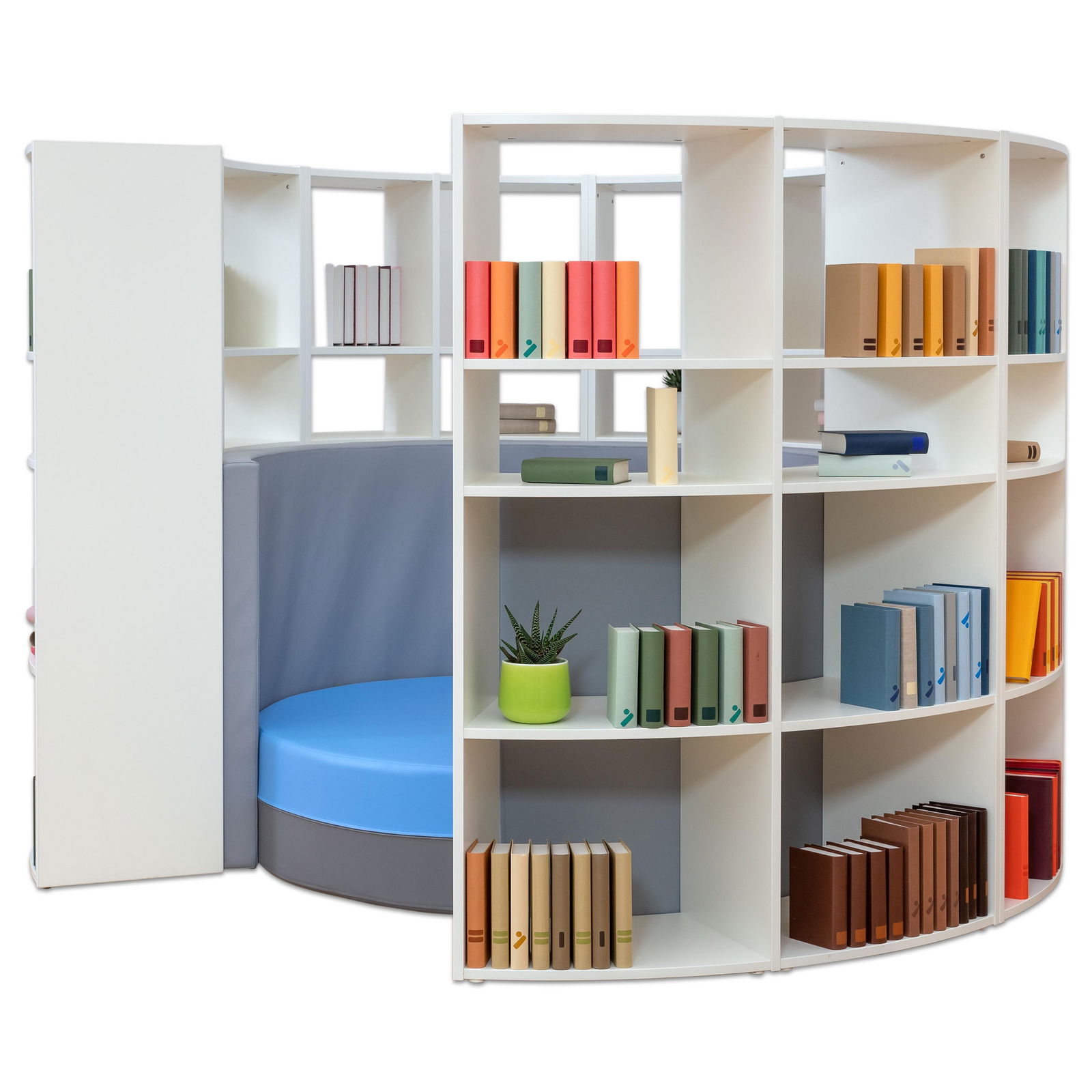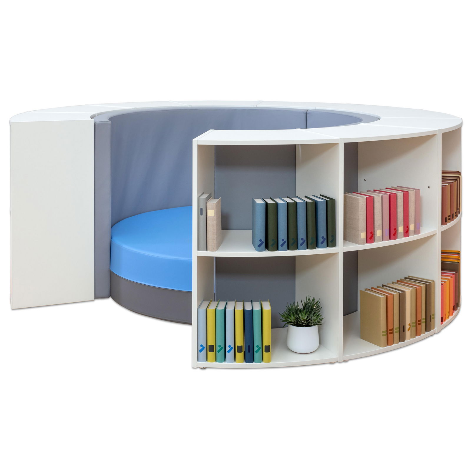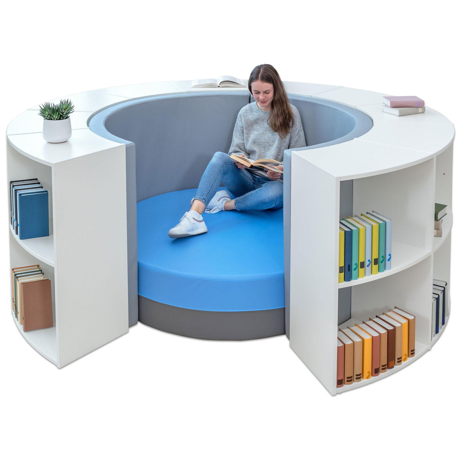 Harmonie im Raumdesign: Die Polster sind exakt auf die Maße der Lesetreff-Regale abgestimmt. Einfach in die kreisförmig aufgebauten Regale eingelegt, schließen sie bündig ab und bilden eine optisch und funktional einheitliche Einheit. Es entsteht ein „Nestcharakter“, der Kindern Sicherheit und Ruhe vermittelt. - Pflegeleicht und hygienisch