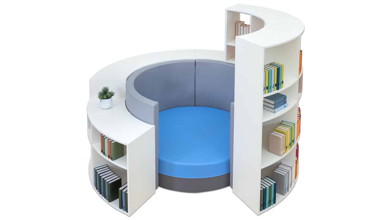 Das Rundregal ‚Rondio Duo‘ bietet nicht nur viel Stauraum, sondern kann auch als Raumteiler verwendet werden. Durch seine gebogene Form entstehen angenehme Rückzugszonen, die perfekt mit den passenden Polstern kombiniert werden können. Dies bietet Kindern einen idealen Ort, um sich auszuruhen und gleichzeitig abzuschalten – der perfekte Gegenpol zu stressigen Lernphasen.