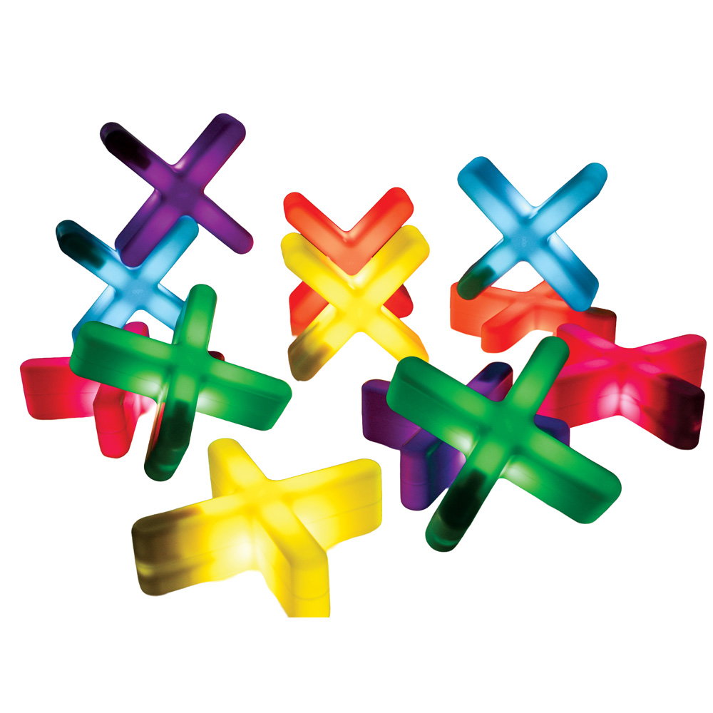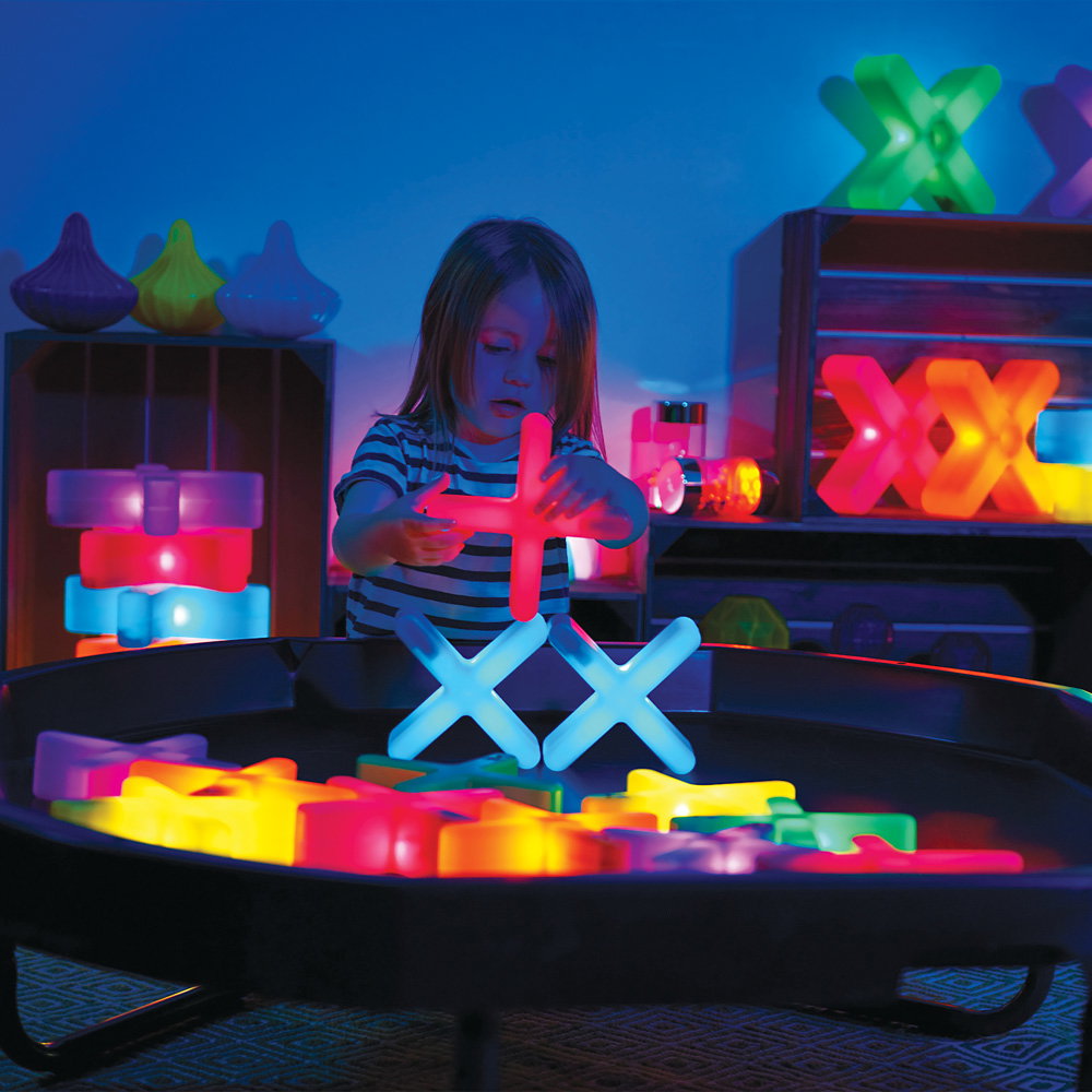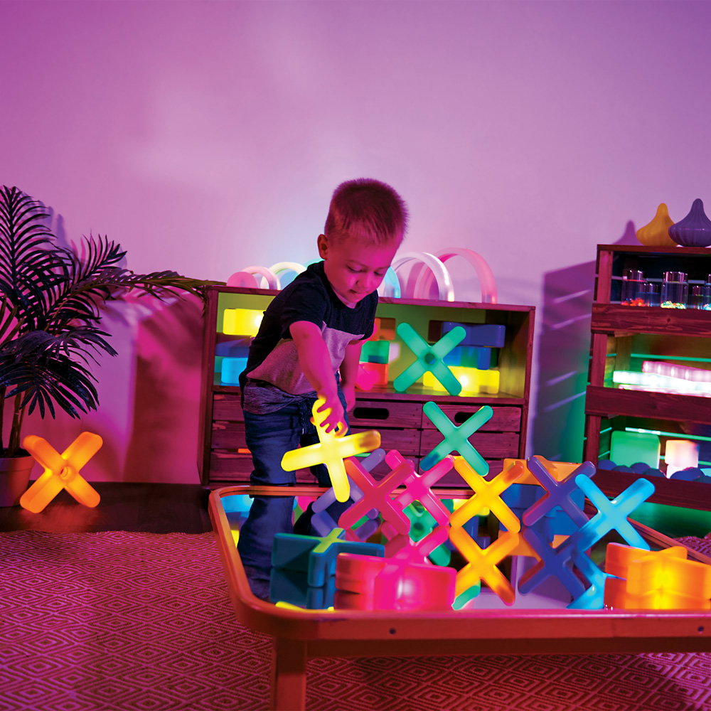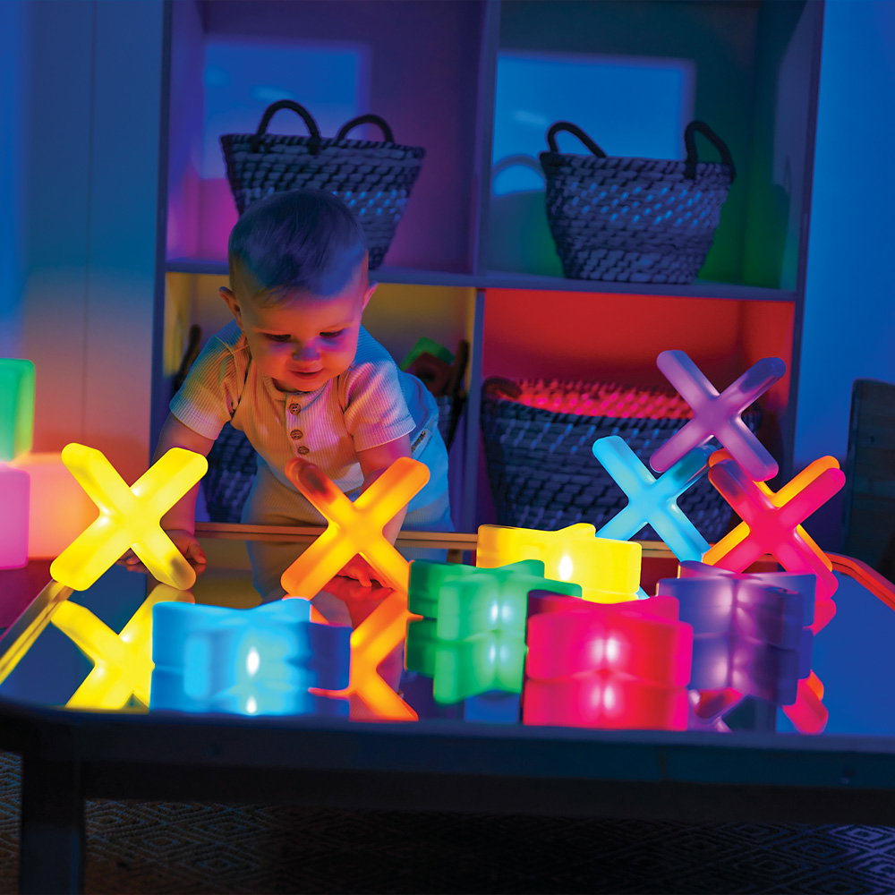 Das Besondere an diesen Bausteinen ist ihre integrierte Leuchtfunktion. Per einfachem Knopfdruck werden die Kreuze aktiviert und beginnen, in einer klaren, kräftigen Farbe zu leuchten. Dieses sofortige visuelle Feedback fesselt die Kinder, weckt ihr Interesse und motiviert sie dazu, die Bausteine immer wieder neu zu arrangieren und zu entdecken. Das farbige Leuchten hat nicht nur einen hohen Aufforderungscharakter, sondern schafft auch eine beruhigende, stimmungsvolle Atmosphäre, die sich ideal für Ruheräume oder sensorische Ecken eignet.