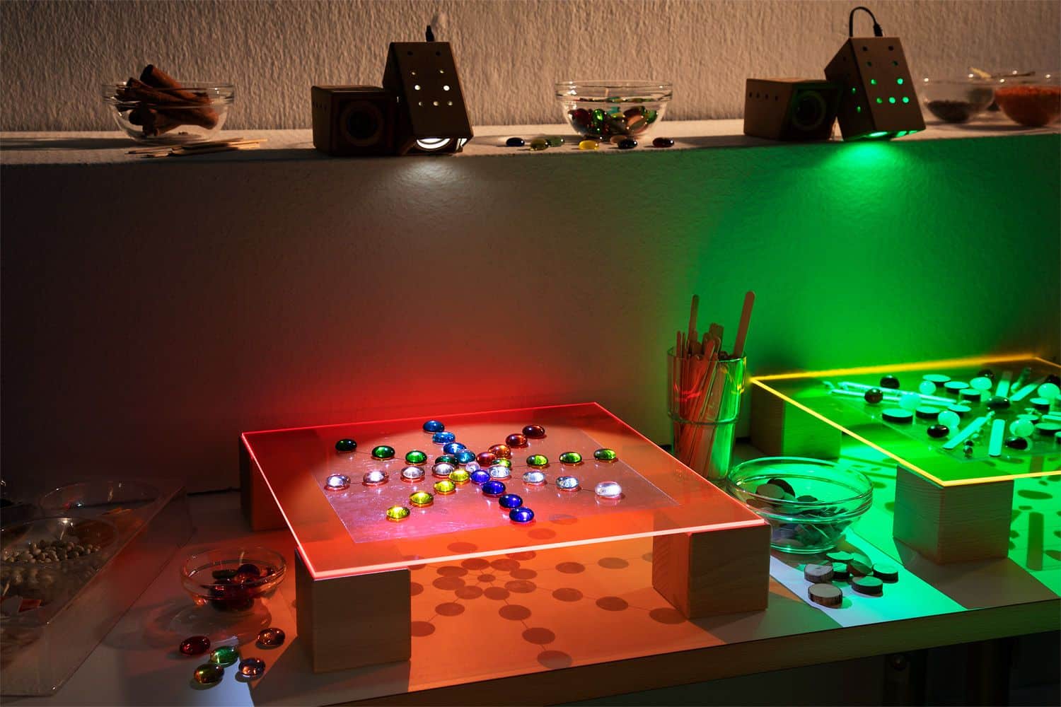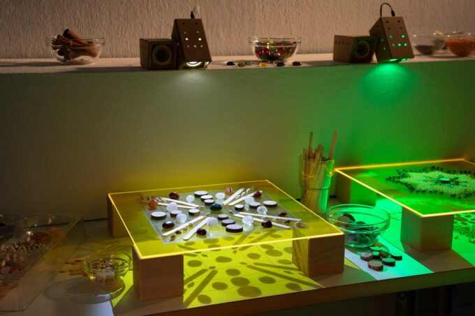 Die fluoreszierenden Kanten der Acrylplatten sorgen für einzigartige Lichteffekte, die die Fantasie anregen und einen zusätzlichen visuellen Reiz für die Kinder bieten. Durch das Überlagern der bunten Platten entstehen spannende Farbmischungen, die in Kombination mit den recycelten Musterfolien zu immer neuen Gestaltungen inspirieren. Dieses innovative Spielmaterial, das aus der Klax-Pädagogik stammt, ist nicht nur für den häuslichen Gebrauch, sondern auch ideal für den Schulbereich geeignet und verleiht jedem kreativen Projekt einen besonderen Glanz.