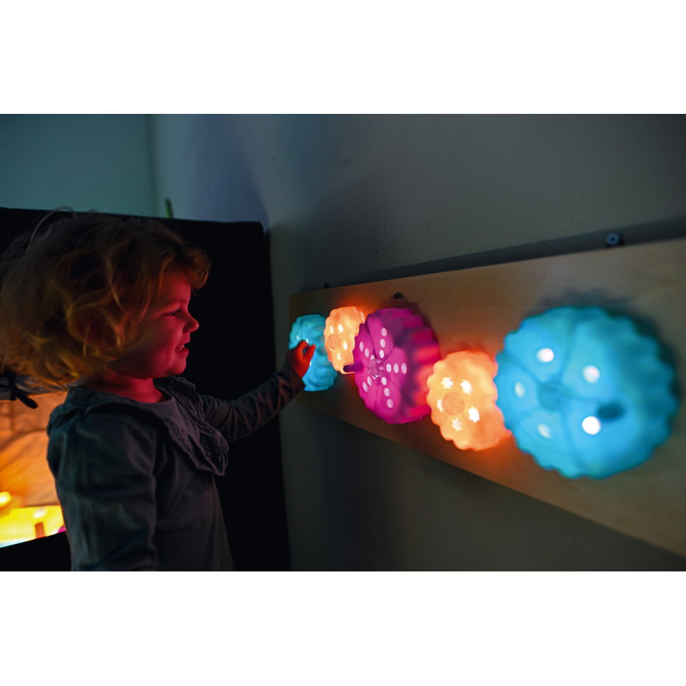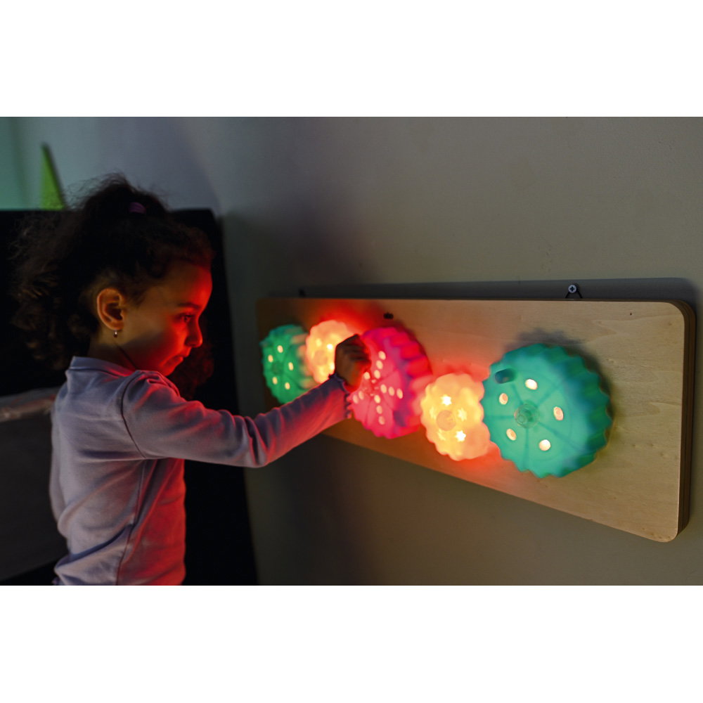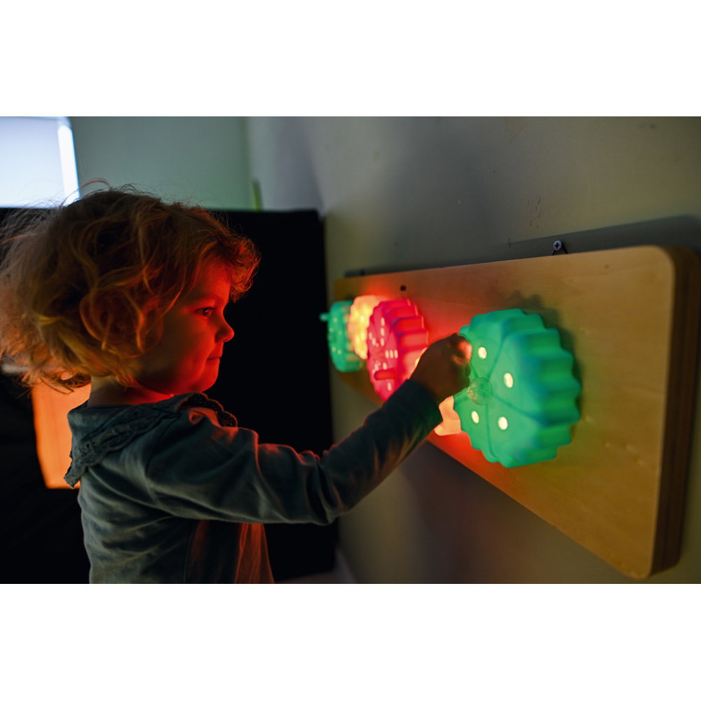 Entdecken Sie das Motorikboard Leuchtende Zahnräder. Die Räder wechseln beim Drehen die Farbe, fördern Feinmotorik und Konzentration. Ideal für Wand & Tisch.