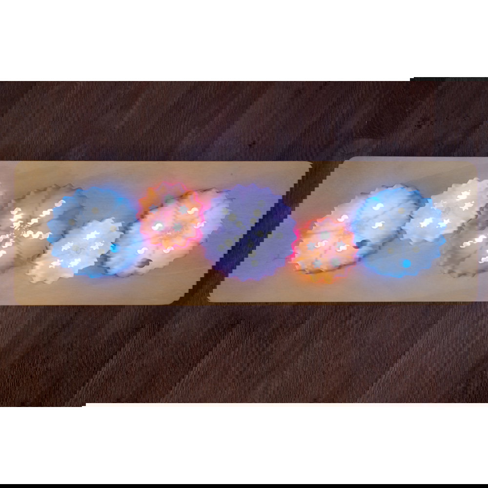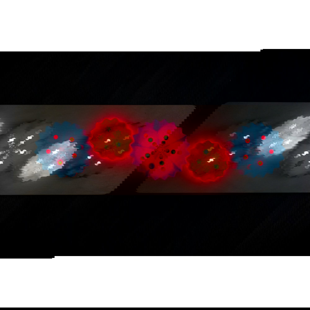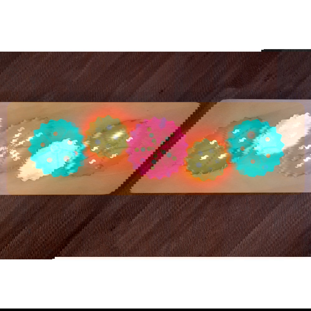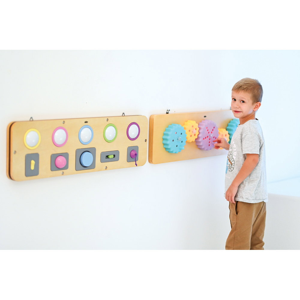 Entdecken Sie das Motorikboard Leuchtende Zahnräder. Die Räder wechseln beim Drehen die Farbe, fördern Feinmotorik und Konzentration. Ideal für Wand & Tisch.