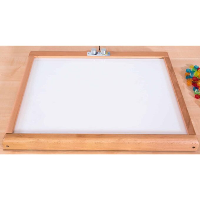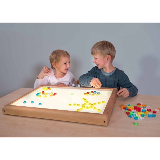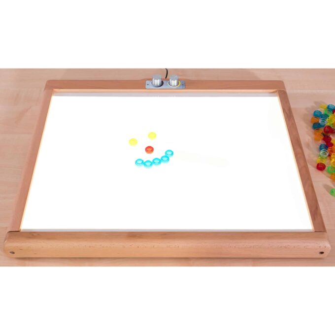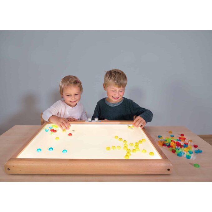 Die große beleuchtete Fläche von 57 x 42 cm ist ideal für mehrere Kinder gleichzeitig, sodass sie gemeinsam spielen, experimentieren und sich gegenseitig staunen lassen können. An den zwei Drehschaltern können die Helligkeit und die Lichttemperatur nach Belieben eingestellt werden – von warmem Weiß bis hin zu kühlem Weiß, was eine Vielzahl von Stimmungseffekten ermöglicht.